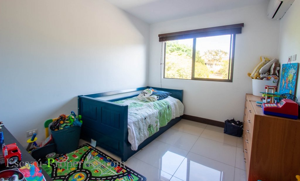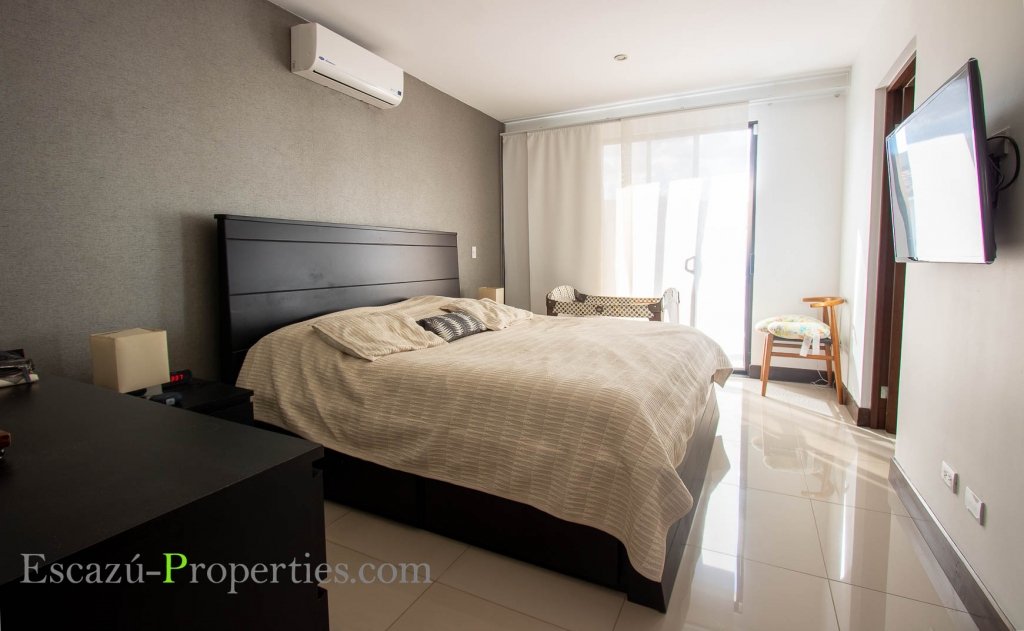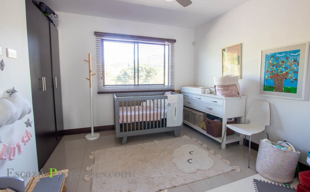 Esta casa tipo town house le ofrece justo lo que una familia necesita o simplemente alguien que quiere espacio. Dos niveles con tres dormitorios en el segundo piso con pisos en porcelanato, cielos en gypsum algunas cenefas, unidades de aire acondicionado, abanicos en techo, closets, puertas y rodapiés en madera y abundante ventanería en aluminio que permiten ventilación cruzada e iluminación natural, incluso para disfrutar de la vista del vecindario y los atardeceres. El dormitorio master con walk in closet.