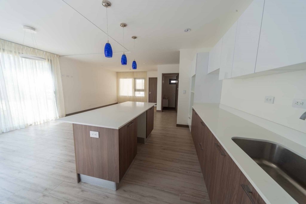 La cocina se encuentra equipada con una isla central de apoyo que funciona también como desayunador, así como numerosos muebles de almacenamiento algunos de ellos aéreos hechos de innovadora melamina y sobres de cuarzo blanco un material de gran belleza estética, resistencia y durabilidad.