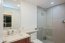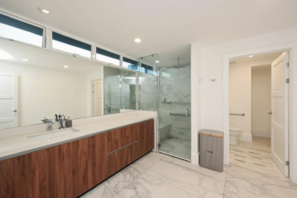 Los baños están bien equipados con mamparas de vidrio, grifería moderna, espejos y muebles que ayudan a mantener el orden.