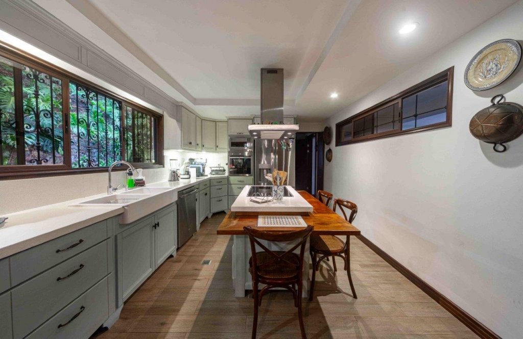 La cocina es otro punto fuerte, amplia, funcional y muy bonita. Tiene muebles de almacenamiento de excelente calidad, una isla central con cocina empotrada, desayunador en madera, extractor aéreo y acceso directo a la terraza, lo que la hace perfecta para el día a día y para recibir visitas.