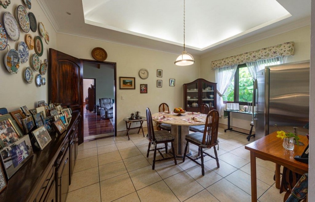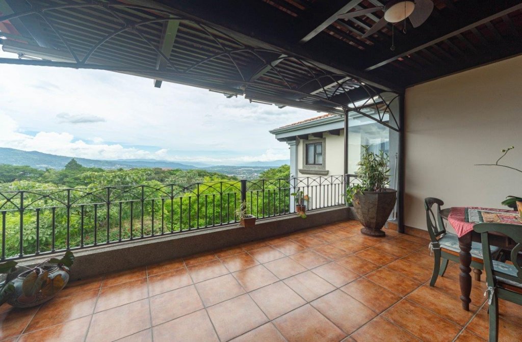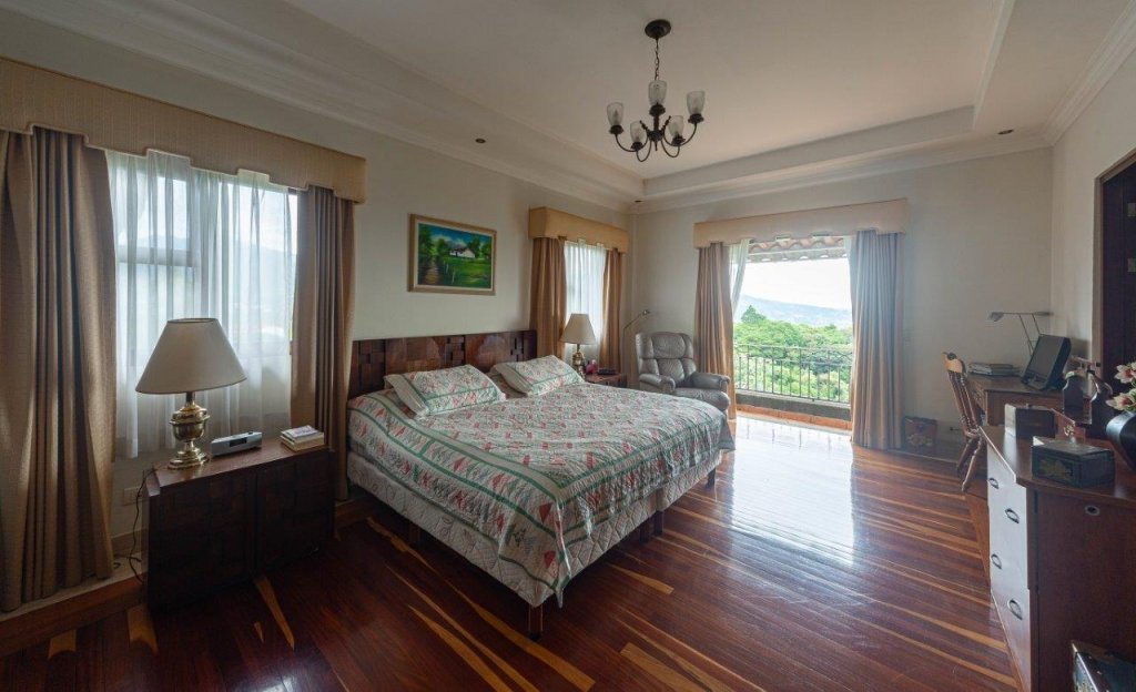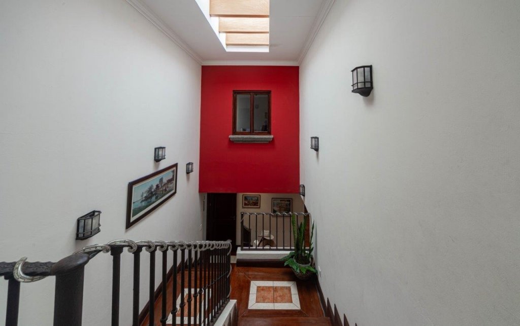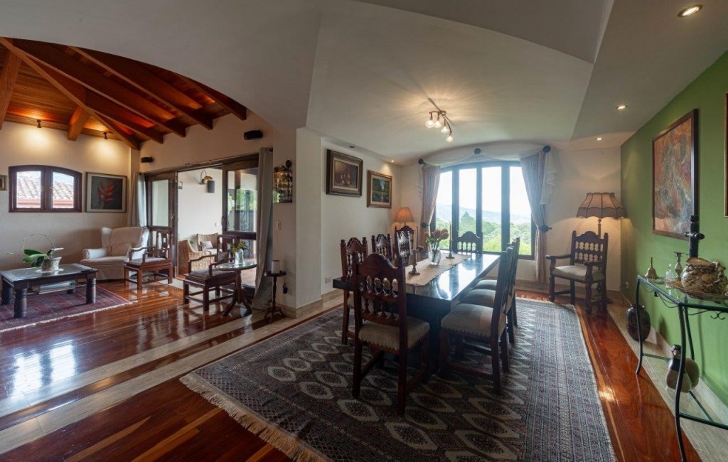La residencia, con un diseño colonial de gran distinción, combina materiales nobles como la madera, hierro forjado y pisos de porcelanato, logrando un ambiente elegante y acogedor al mismo tiempo. La sala principal sorprende con un cielo raso de vigas expuestas, un bellísimo detalle arquitectónico. Este espacio se conecta con una amplia terraza, ideal para recibir amigos o compartir en familia, siempre acompañados de la vista y la brisa de la colina.
