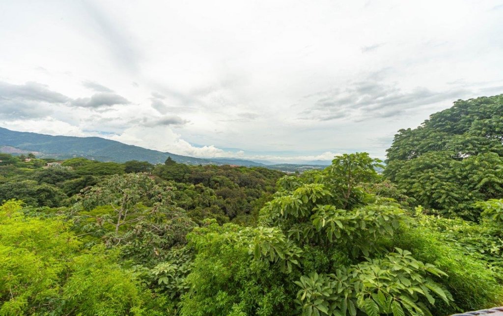 El terreno es verdaderamente espectacular, con mil metros cuadrados ubicados en lo alto de una colina. Esta posición privilegiada regala vistas panorámicas impresionantes hacia el verde de los árboles que rodean la propiedad y, a lo lejos, la ciudad que se asoma en el horizonte.