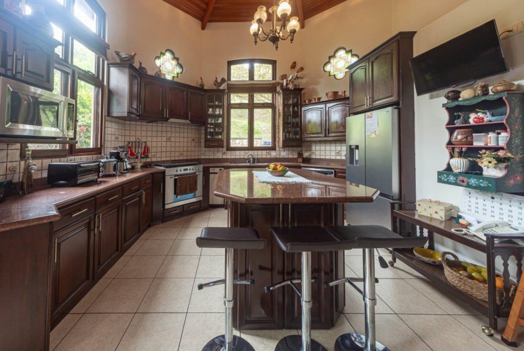 La cocina es otro de los grandes atractivos, cálida y funcional, equipada con muebles de madera en excelente estado, amplios espacios de almacenamiento y una isla central con sobres de granito.