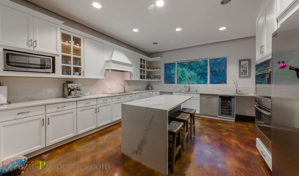 Para servir hasta estos espacios, la cocina se ubicó estratégicamente cerca de lo anterior. Es muy amplia y con un estilo country en sus muebles, que fueron sellados con blanco cuarzo. Cocina de vitrocerámica bajo campana en aluminio recubierta para hacer juego con los muebles y mantener el estilo decorativo. Doble horno empotrado en pared, enfriador para vino, lavaplatos, refrigeradora doble ancho, todo en acero inoxidable línea de lujo. Isla de trabajo en el centro, con espacio para desayunador.