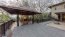 La terraza, en tablilla de madera, se extiende hasta la piscina, con caída infinita. Un corredor interno con un fire pit y una estructura adicional al extremo opuesto de la terraza principal, cubierto y protegido por barandas en madera y metal.