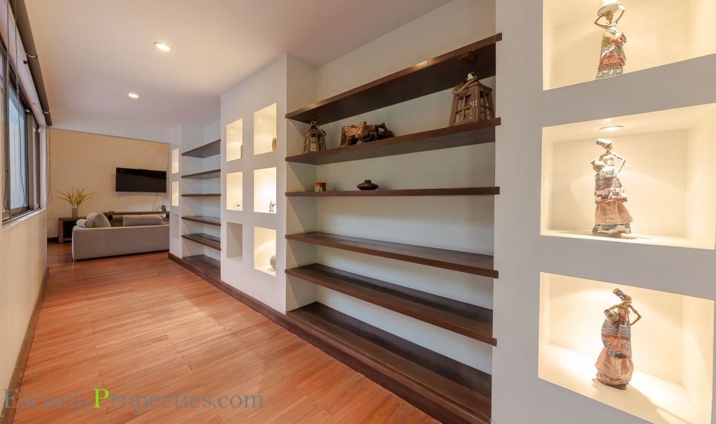 La mezcla de materiales se hace más evidente en los restantes dormitorios, donde uno es completamente en madera, con cielos siempre en caña brava, aquí imagínese que está en una cabaña en el medio del bosque, pero al salir, volverá a topar con la elegancia y modernismo incluso en los pasillos, con estantería y espacio para obras de arte.