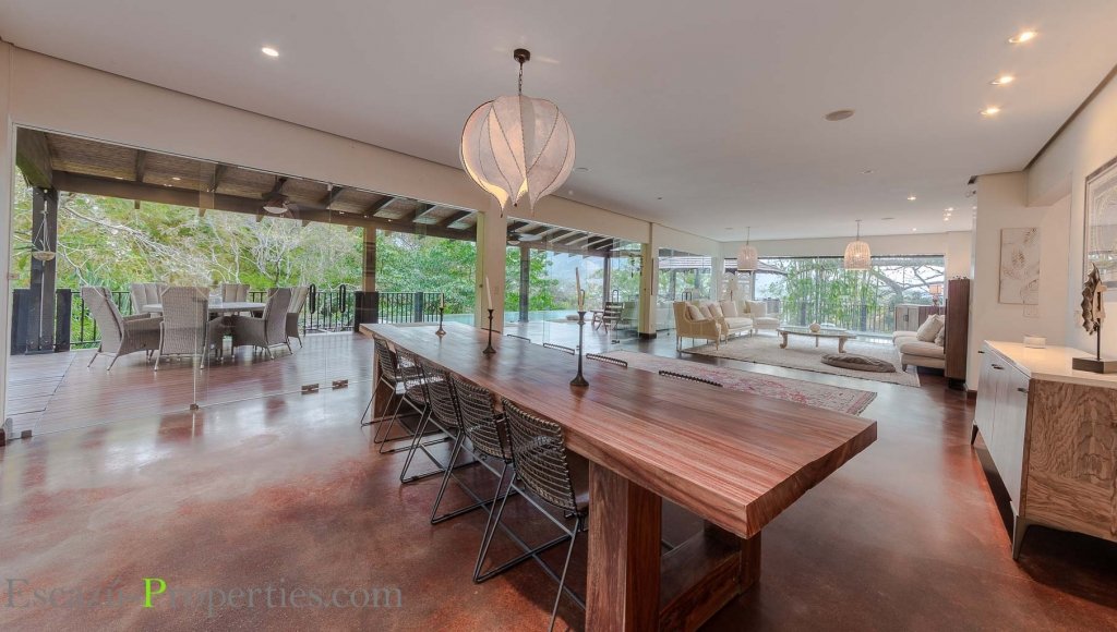 Esta Casa con vista Villa Real Santa Ana, Costa Rica, tiene el primer nivel abierto, con una mezcla de acabados espectacular, refrescantes, modernos, sencillos que van desde el concreto lujado en pisos, hasta cielos en caña brava en terrazas con vigas expuestas en madera sólida y paredes totalmente en vidrio, para no perder la vista al bosque y que, al abrirse en su totalidad, traen el espacio exterior y la terraza hasta la intimidad de la vivienda, llenándola de frescura y libertad, sin perder por un momento la privacidad.