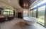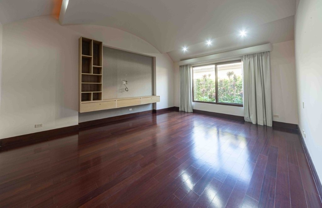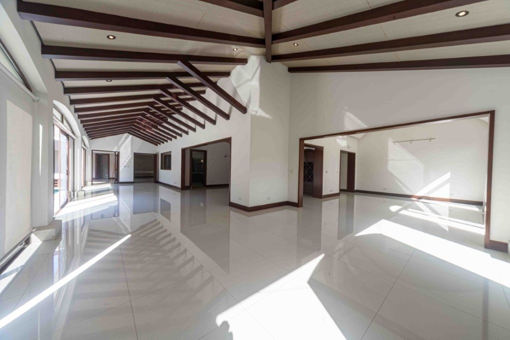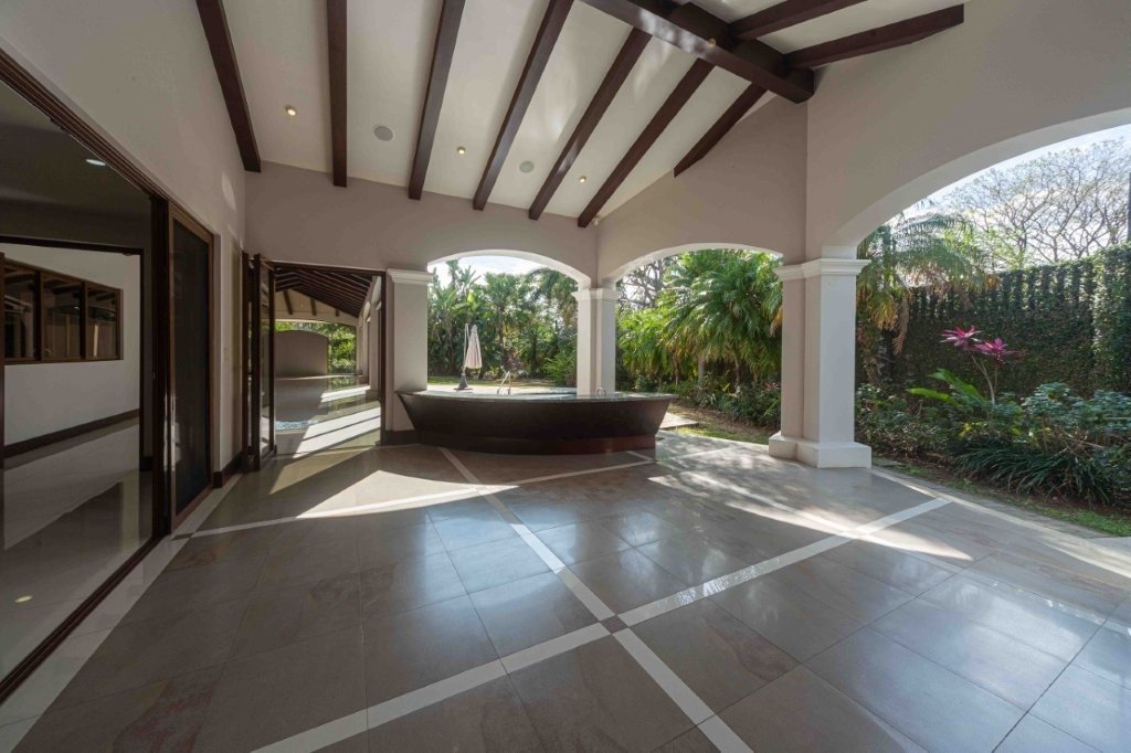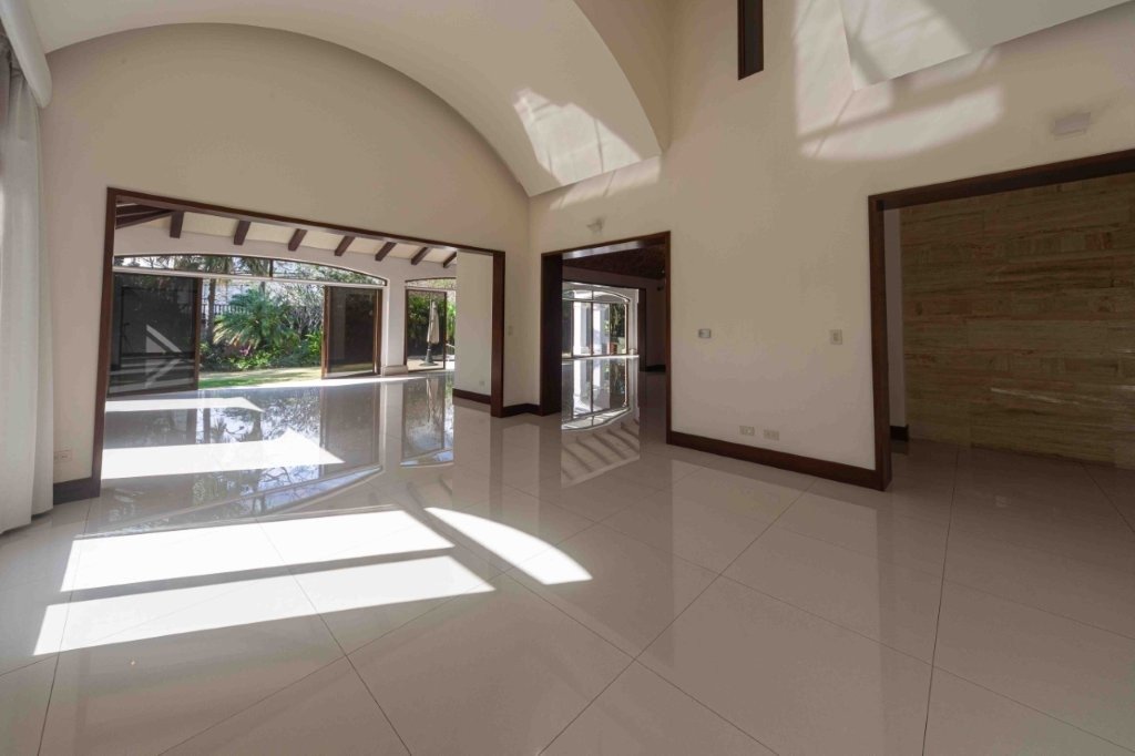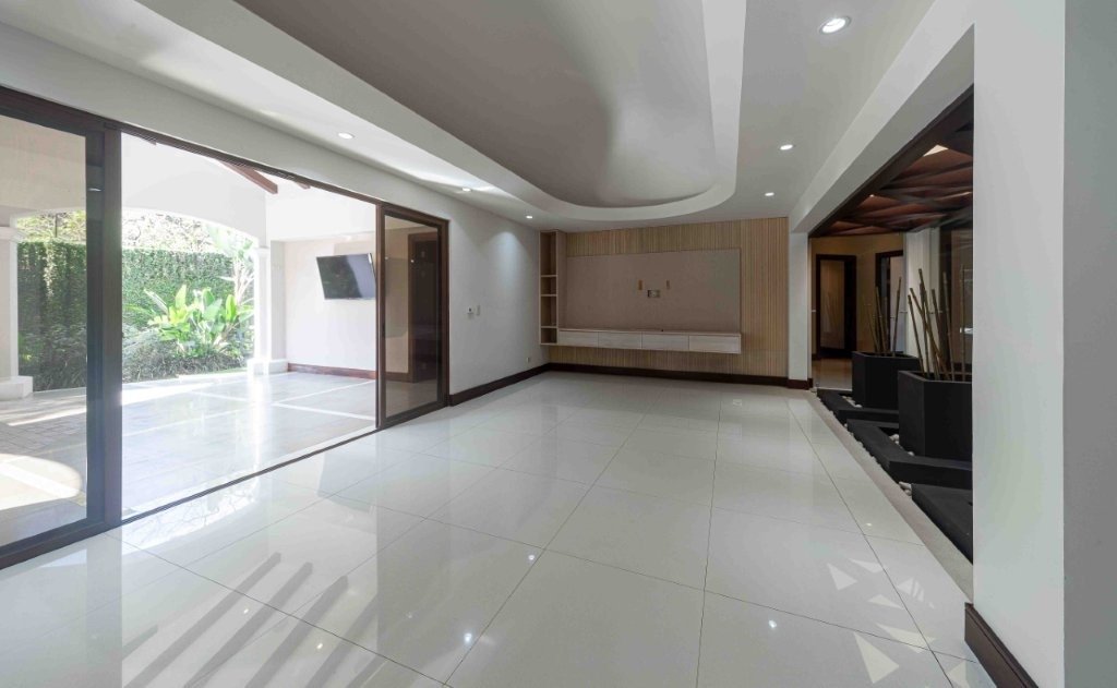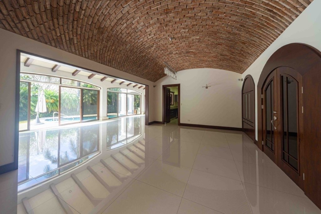 Al ingresar, el salón principal se roba la atención por su tamaño y versatilidad. Los pisos de porcelanato blanco hacen que todo se vea más limpio y luminoso, mientras que las vigas de madera en el cielo raso aportan ese toque cálido que equilibra el espacio. Aquí perfectamente se pueden integrar varios ambientes sin problema, tales como una sala formal, una sala más casual, comedor y hasta un área de televisión. Más adelante aparece un segundo salón que funciona como transición hacia el exterior, y que tiene un detalle muy especial, un techo curvo con ladrillo refractario que le da una personalidad única y lo convierte en uno de los rincones más bonitos de la casa. Casa Elegante Bosques de Lindora.