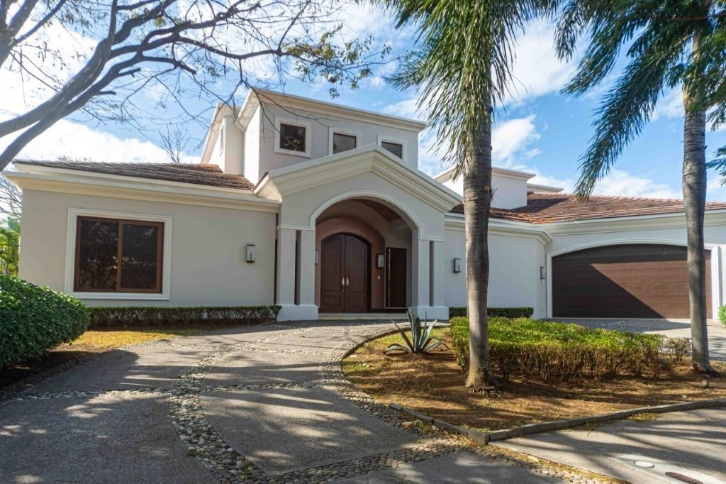 Casa Elegante Bosques de Lindora. Lo primero que se siente en esta propiedad es el espacio, tanto adentro como afuera. Desde que se cruza la entrada, la casa transmite amplitud y una construcción sólida que mezcla muy bien lo clásico con detalles más actuales. La fachada tiene carácter propio con columnas bien definidas, un arco de entrada que marca presencia, techos de teja natural y una media rotonda con piedra decorativa que además de verse bien, facilita muchísimo el acceso y movimiento de vehículos.