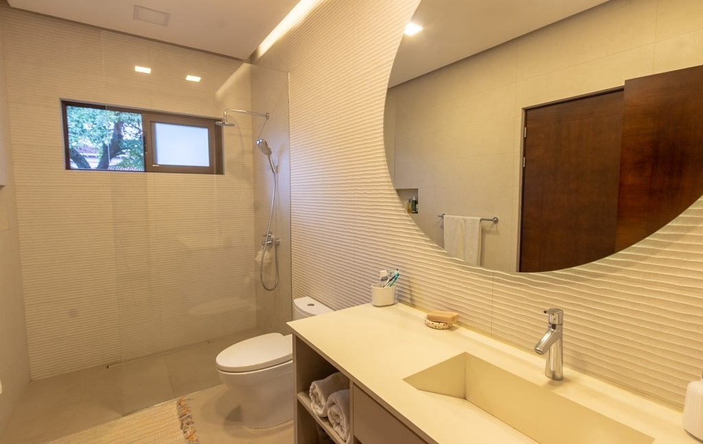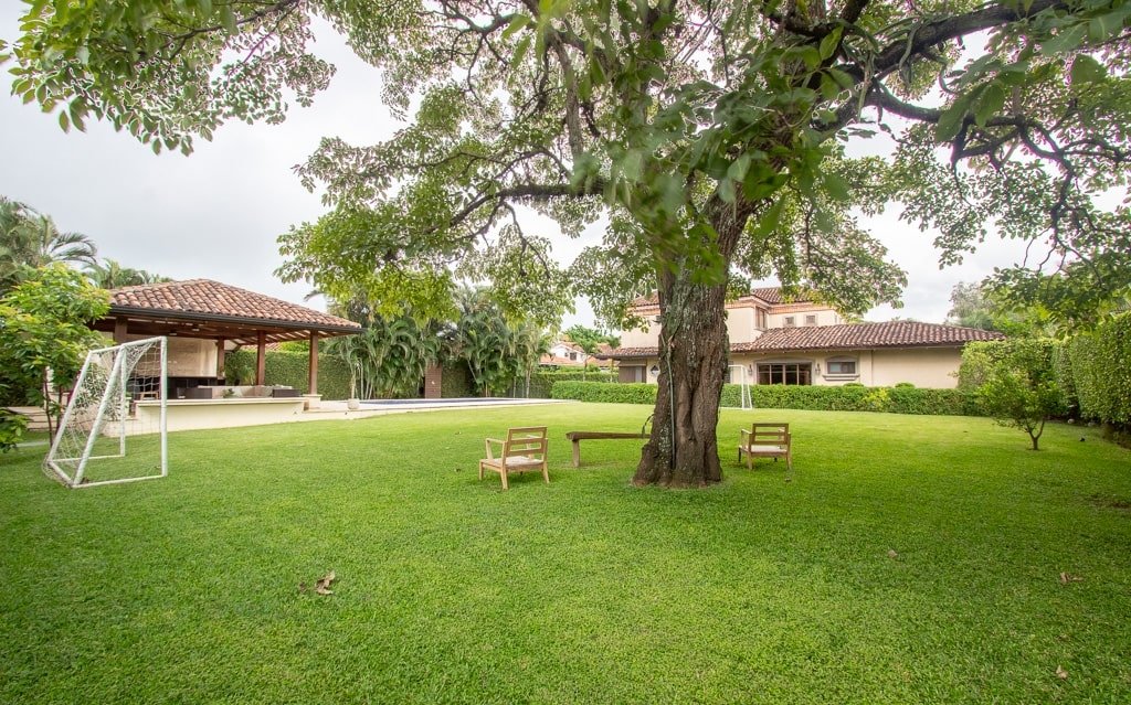 La iluminación natural es protagonista en todos los espacios, gracias a ventanales y puertas de vidrio que se abren hacia el entorno exterior, creando una conexión perfecta entre el interior y el gran jardín que rodea la casa. Este amplio espacio verde es ideal para la vida social y familiar, y se complementa con una piscina privada y un rancho equipado para disfrutar de reuniones al aire libre.