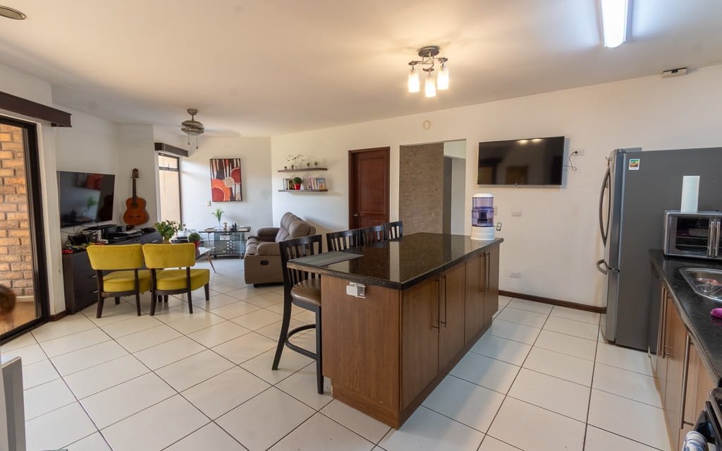 El área social se presenta integrada, uniendo sala, comedor y cocina en un concepto moderno que favorece la convivencia y el aprovechamiento del espacio. La cocina, con acabados de buena calidad, ofrece tanto estética como funcionalidad, convirtiéndose en un punto central del hogar. Esta área se extiende hacia una agradable terraza, perfecta para disfrutar de reuniones o momentos de descanso con vista a los jardines.
