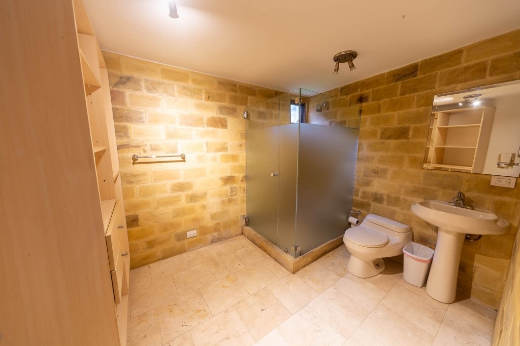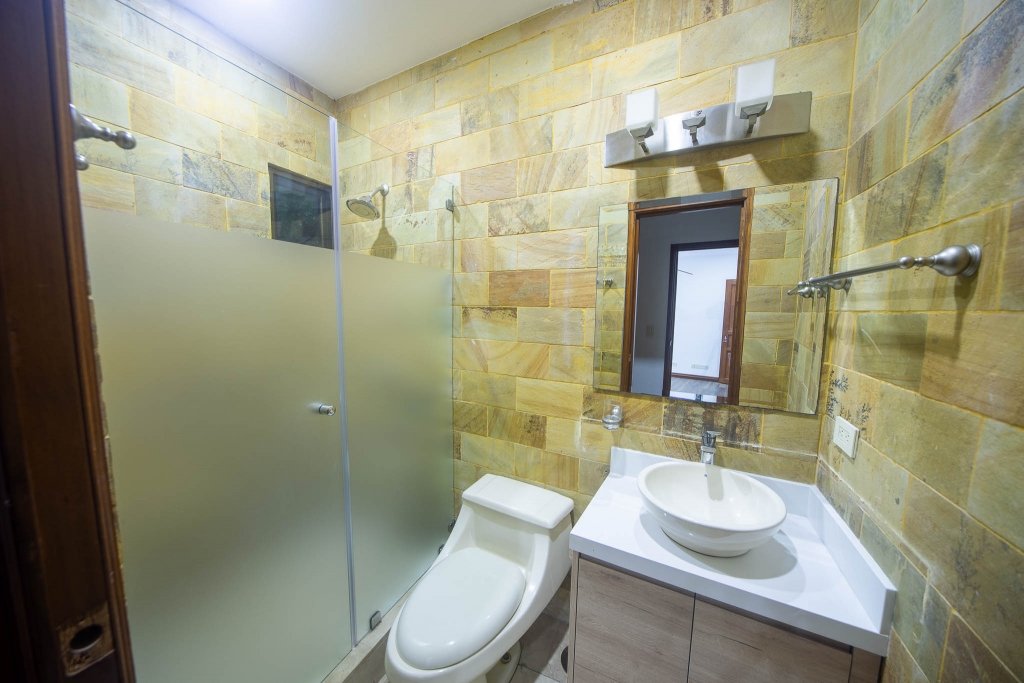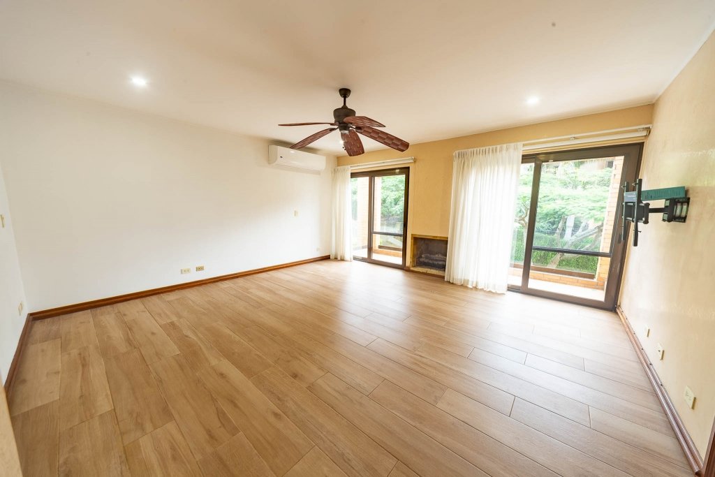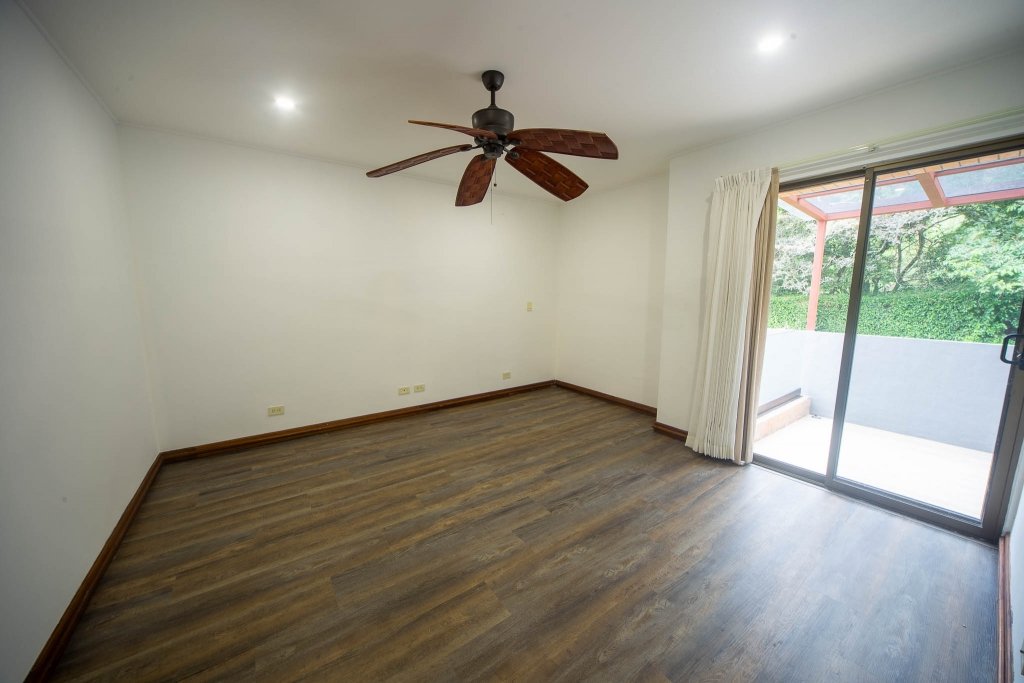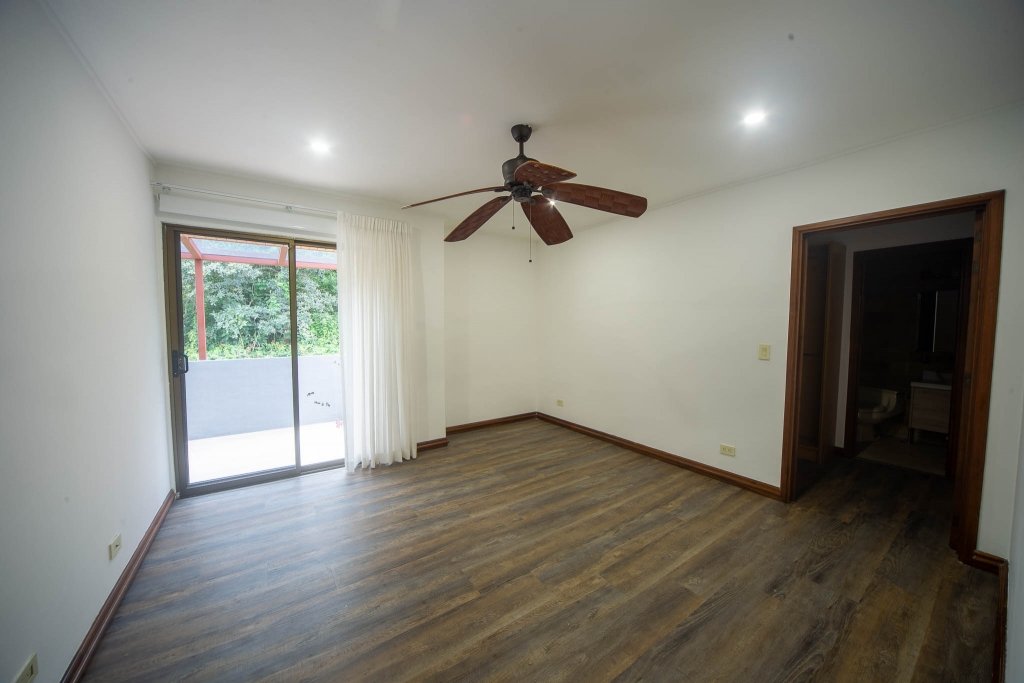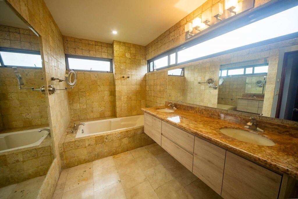 En la planta superior se ubican las habitaciones, todas amplias y luminosas, con pisos en porcelanato tipo madera y acceso al balcón desde donde se disfrutan vistas al verde paisaje. La habitación principal es un verdadero oasis de relajación, con su baño privado que incluye tina tipo jacuzzi, walk-in closet y una elegante chimenea.
