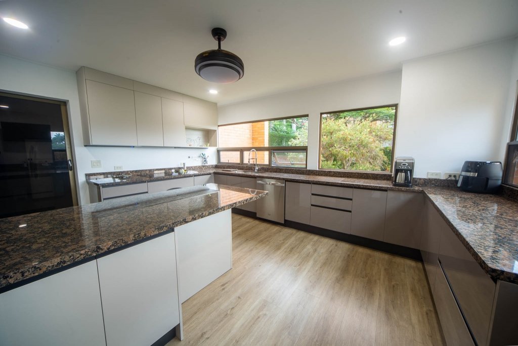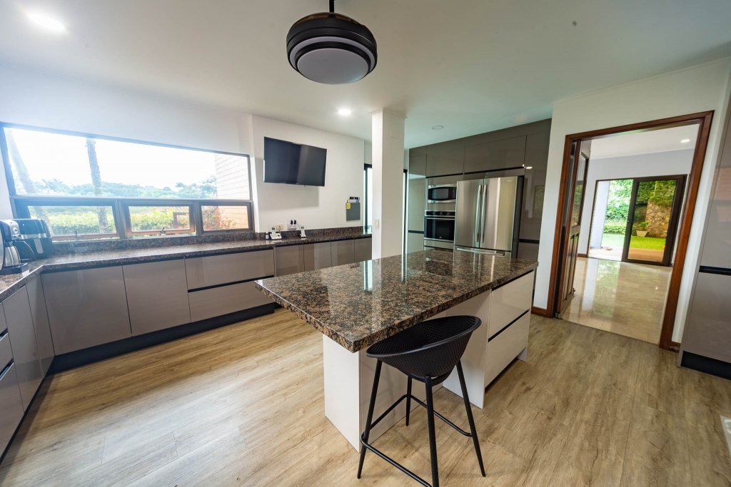 Al ingresar, un salón principal de gran amplitud recibe con elegancia, combinando áreas de estar, bar y sala de recibimiento en un solo espacio de ambiente cálido. El comedor se conecta directamente con la cocina, moderna y funcional, equipada con amplios gabinetes en melamina gris, sobres de cuarzo y una isla central que funciona como desayunador. Grandes ventanales corredizos se abren hacia una terraza techada con lavatorio y mostrador independientes, perfecta para reuniones sociales.