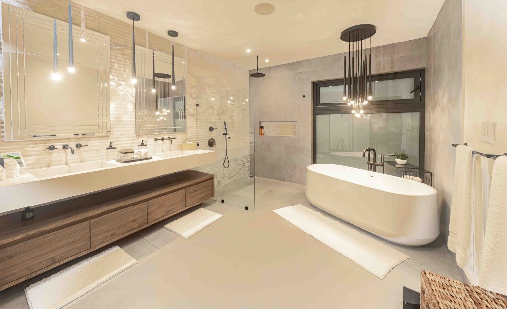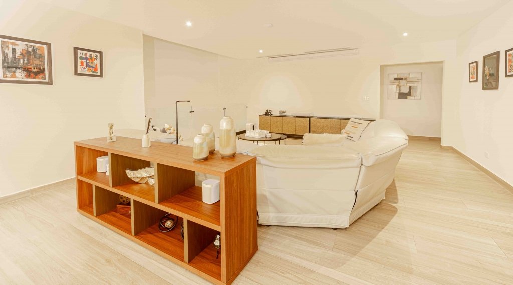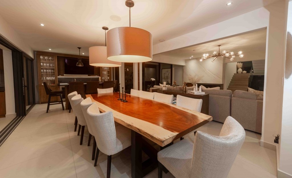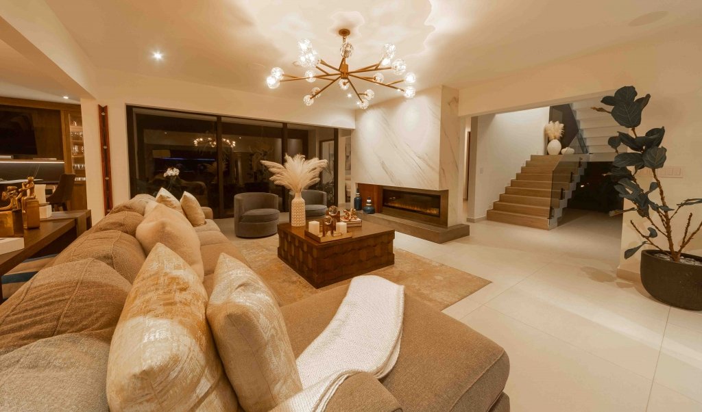 La casa tiene 535 m² de construcción, y su estilo moderno ofrece un diseño arquitectónico refinado. Al entrar, se percibe la combinación cuidada de materiales: pisos de porcelanato mate, paredes con aplicaciones en cuarzo, y una escalera de líneas limpias con barandas en vidrio que añade ligereza visual. Un sistema de iluminación LED bien distribuido realza cada rincón de forma sutil pero impactante.