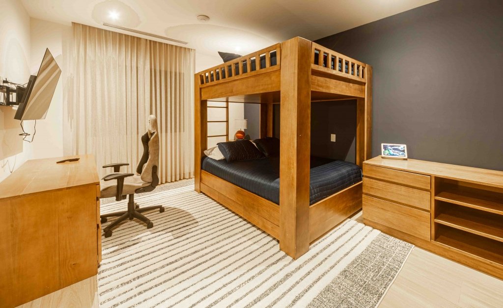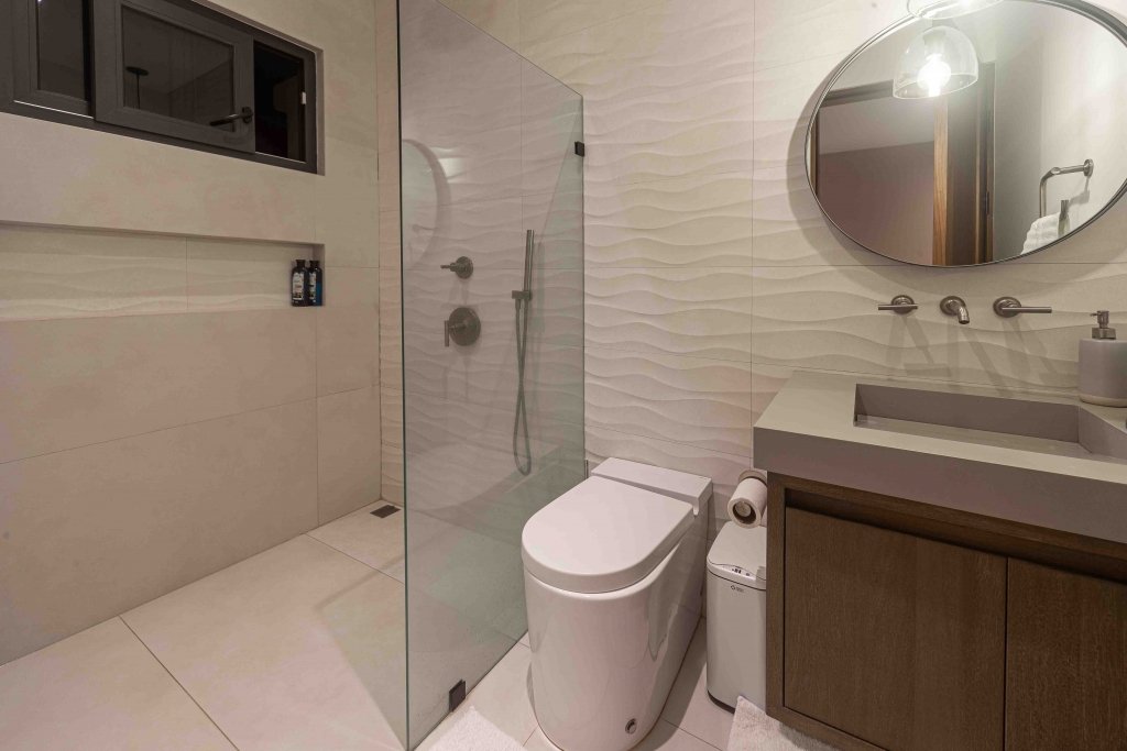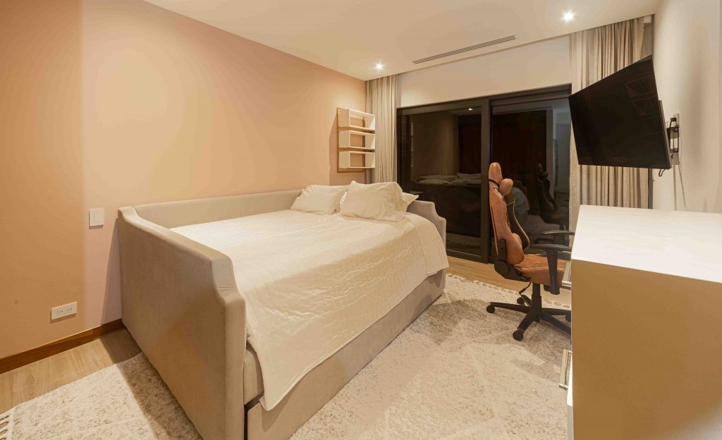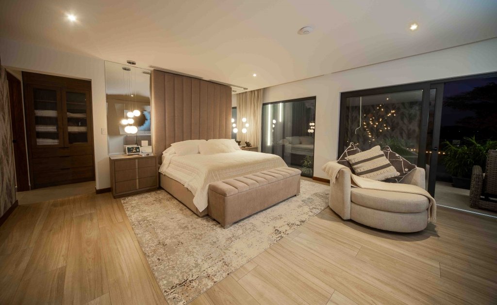 La casa cuenta con cinco dormitorios, todos muy generosos en tamaño; hay espacio para incluir no solo la cama, sino también un sofá o un escritorio. El dormitorio principal es una verdadera suite de lujo, con baño privado, tina para relajarse y acceso a un balcón privado desde el cual se puede contemplar los hermosos atardeceres, ideal para leer o simplemente desconectarse.