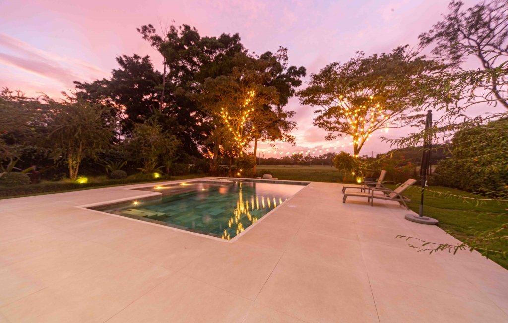 Esta propiedad se asienta dispone de un terreno de 908 m², con vistas privilegiadas hacia el campo de golf. En la parte trasera del lote se ha diseñado un verdadero oasis de relajación con un jardín con zacate perfectamente cuidado que se entrelaza con una piscina privada, ideal para disfrutar fines de semana en familia, organizar asados a la parrilla y disfrutar bajo el sol con total privacidad.