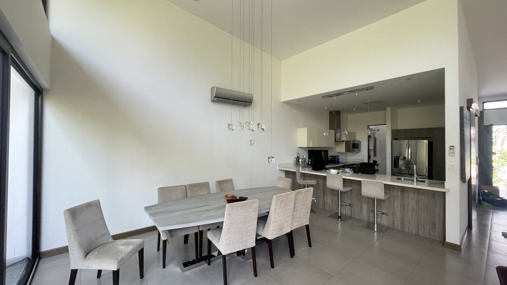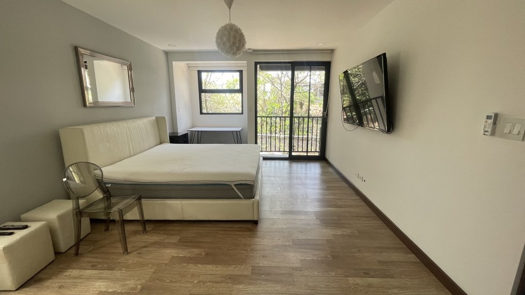 El salón principal está destinado para sala, comedor y cocina semi integrados, así como un precioso balcón que concede vistas a los frondosos árboles, sin duda un espacio que será de sus preferidos para leer, tomar un descanso y tomar el sol por las mañanas. Los amplios ventanales corredizos junto con la doble altura hacen que sea un aposento muy acogedor, muy bien iluminado y elegante.