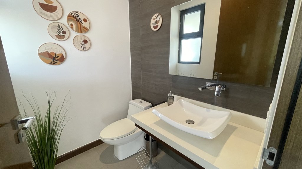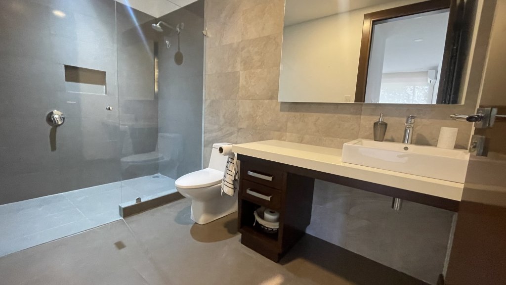 Cabe destacar la novedosa grifería y lavatorios de los baños, además de su amplitud y armoniosa combinación de colores con mamparas de vidrio y espejos. Casas en Escazu 527