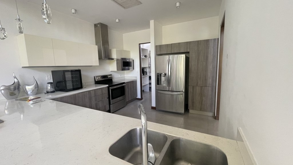 La cocina cuenta con muebles hechos de moderna melamina y sobres de cuarzo, los cuales ofrecen tanto funcionalidad como un acabado de lujo excepcional, a tan sólo pasos encontramos alacena.