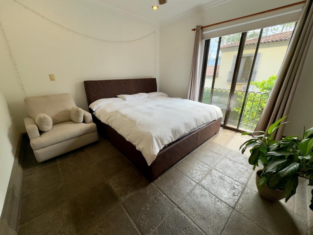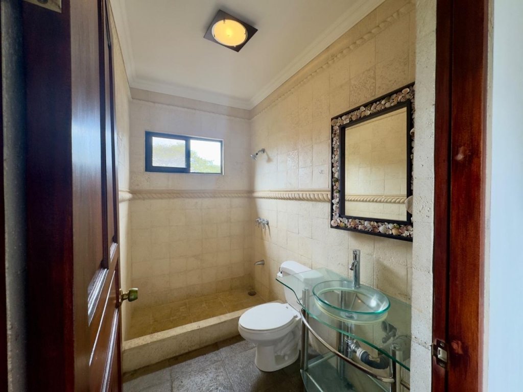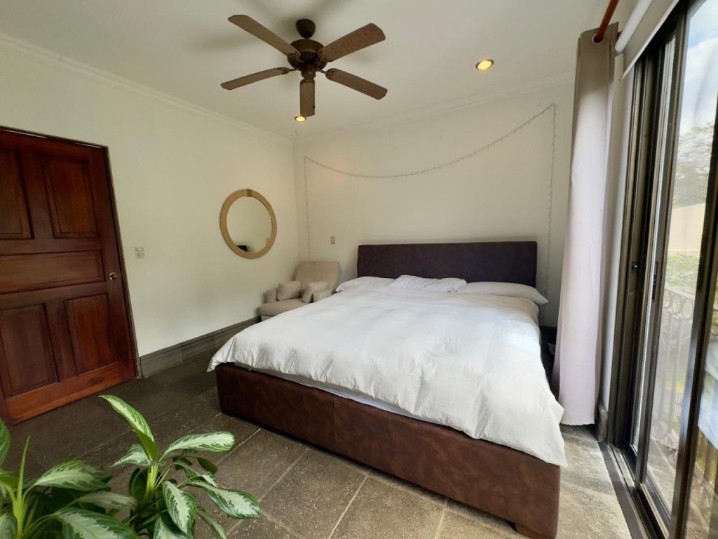 En cuanto a las habitaciones, la propiedad ofrece un total de cuatro dormitorios, todos con baño propio. Una de ellas se ubica en la planta baja, ideal para visitas o personas que prefieren mayor comodidad. Las tres restantes se encuentran en el segundo nivel, donde destaca la habitación principal, que sorprende con un baño de lujo con tina tipo jacuzzi y un walking closet con múltiples repisas y gavetas. El recorrido hacia las habitaciones se embellece con un ventanal sobre la escalera, que permite la entrada de luz natural y realza la sensación de amplitud.