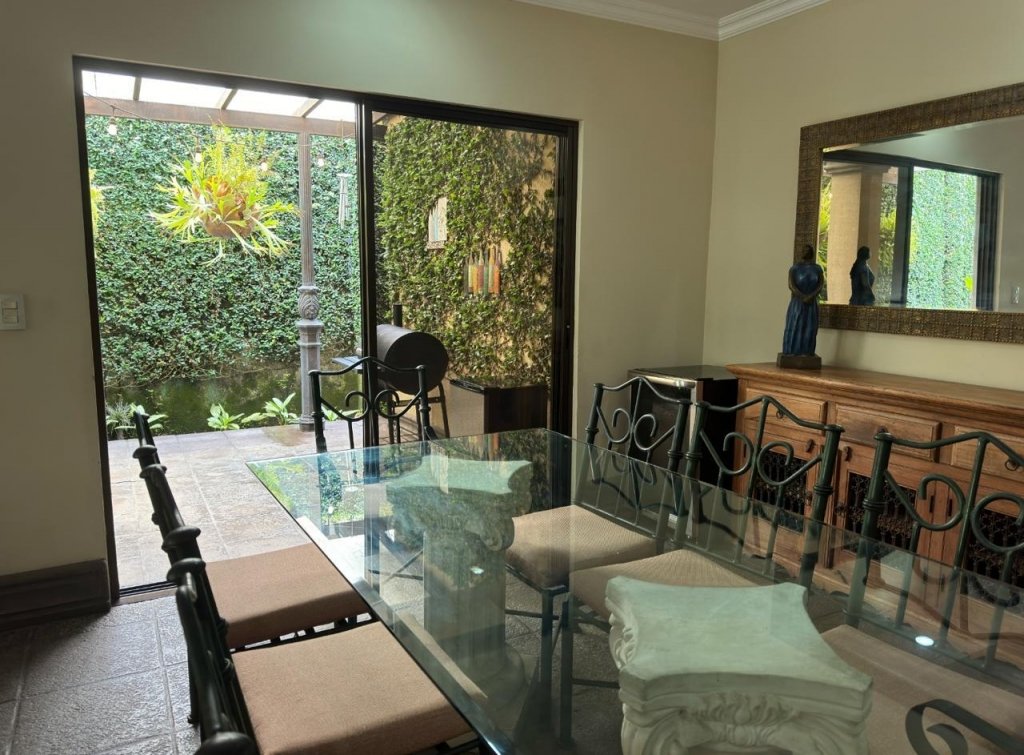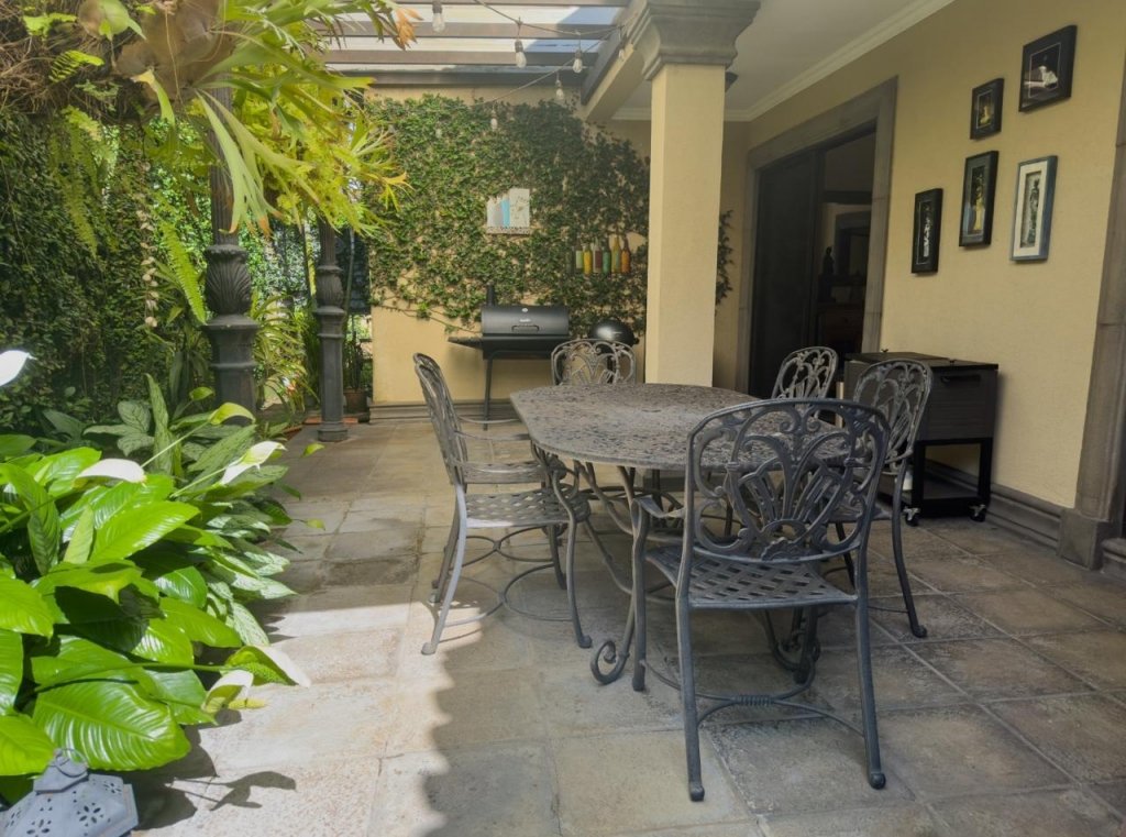 Aquí se encuentra esta espectacular residencia, edificada sobre un terreno plano de setecientos metros cuadrados. El jardín es un verdadero oasis, cuenta con zacate natural, un muro cubierto de hiedra, árboles y arbustos que refrescan el ambiente y ofrecen un paisaje acogedor. Comprar casa en Santa Ana.