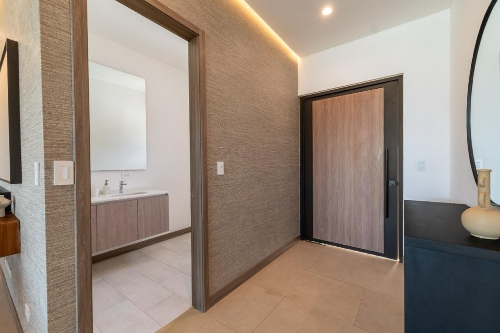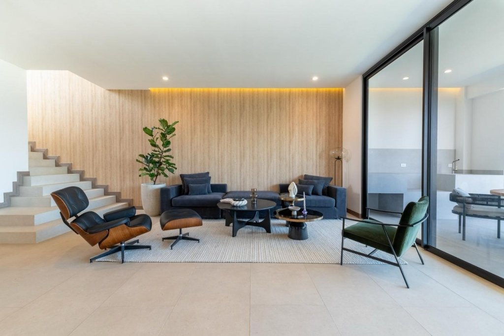 En el primer nivel encontramos la amplia sala de estar. La cocina italiana se diseñó con un filtro de privacidad, además de un espacio para antecomedor. Todos los materiales considerados son de alta calidad y acabados de lujo, sin embargo, también se consideró un margen para que cada propietario pueda hacer única su experiencia personalizándola a su gusto. Condominio Acquarello Escazú.