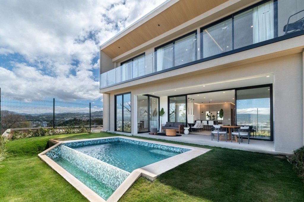 La terraza trasera está estratégicamente ubicada para que se pueda apreciar toda la vista de San José, está justo al lado de la piscina, de manera que puede caminar directo al agua para disfrutar de un chapuzón.