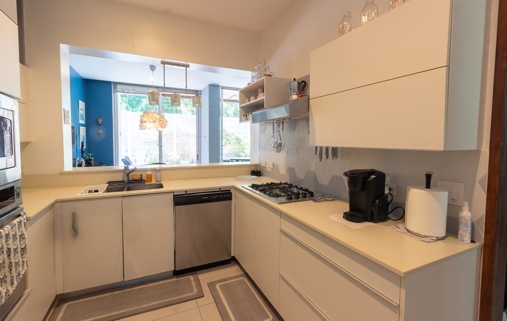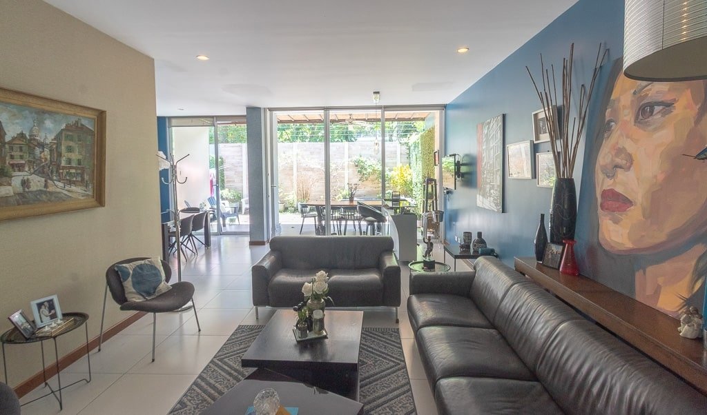 En la planta baja, la casa cuenta con un espacio abierto donde la cocina, la sala y el comedor se integran de manera fluida, favoreciendo la convivencia familiar y social. La cocina presenta un diseño contemporáneo, con acabados de calidad y área suficiente para trabajar cómodamente. Desde la sala se accede a una acogedora terraza y a un pequeño jardín privado, perfectos para disfrutar del aire libre en un ambiente íntimo y tranquilo. Además, dispone de parqueo techado para dos vehículos.