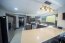 Los muebles de la cocina en melamina de tono gris aportan un aire contemporáneo, mientras que los sobres de cuarzo ofrecen resistencia, higiene y durabilidad, convirtiéndola en una cocina tanto estética como altamente funcional. Parte de este espacio funciona también como desayunador, perfecto para momentos cotidianos en familia.