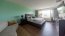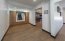 Al ingresar, el salón principal le da la bienvenida con un ambiente cálido y acogedor, gracias a su piso de porcelanato imitación madera que armoniza de manera perfecta con las paredes blancas y el rodapié en madera oscura.