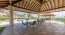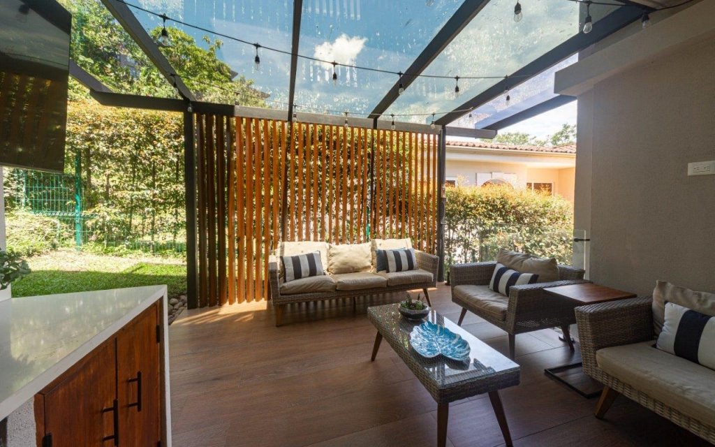Desde la sala se accede a la terraza, una verdadera joya arquitectónica con techo de láminas transparentes y pared en madera decorativa, rodeada de un jardín con zacate natural y piedra ornamental, creando el espacio ideal para compartir en familia o con amigos.