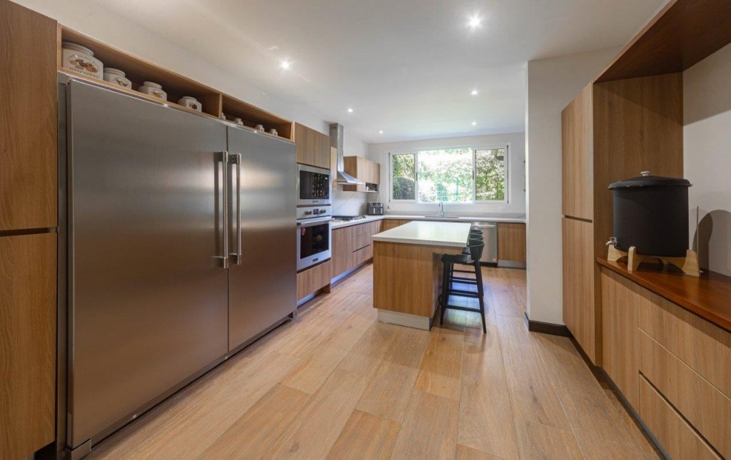 Los amplios ventanales corredizos no solo llenan los espacios de luz natural, sino que permiten disfrutar de la brisa fresca y de las hermosas vistas verdes que rodean la casa.