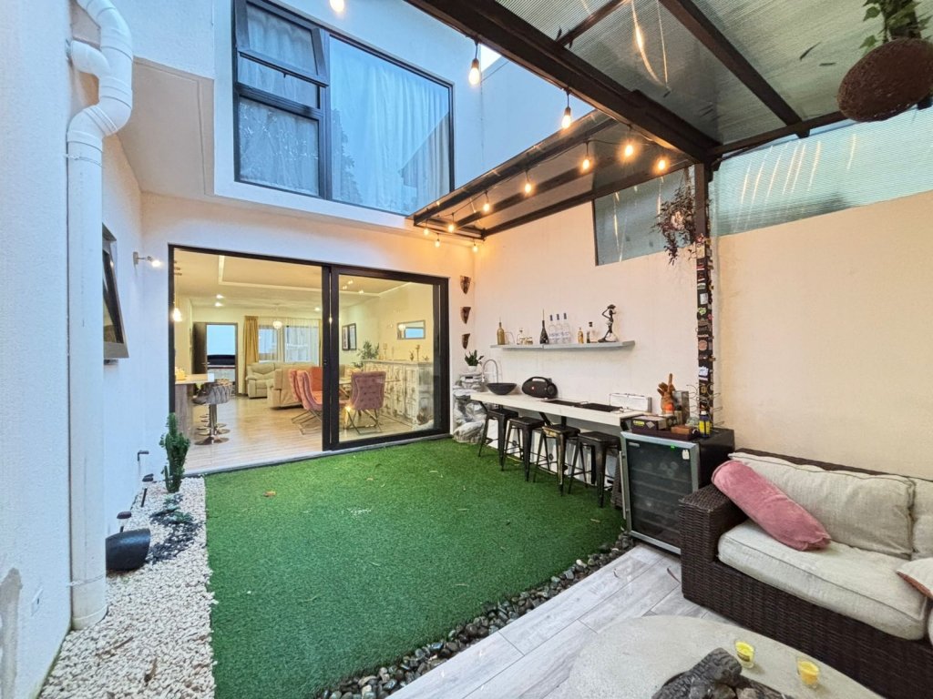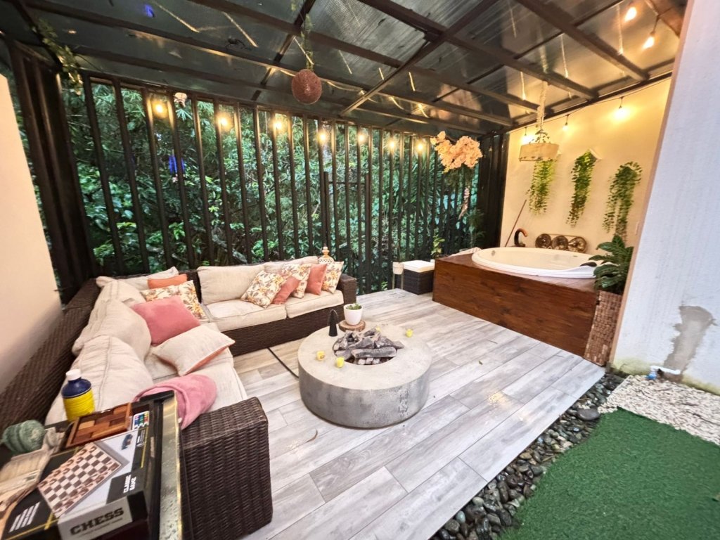 Desde la sala, grandes ventanales corredizos conducen hacia una terraza techada con un ambiente sumamente acogedor, perfecta para disfrutar celebraciones sociales o momentos de descanso. El área exterior incluye césped sintético y un fabuloso jacuzzi privado.