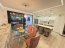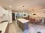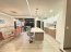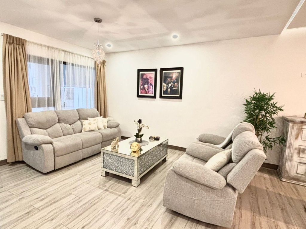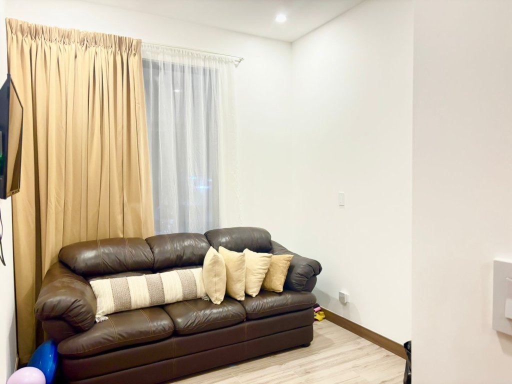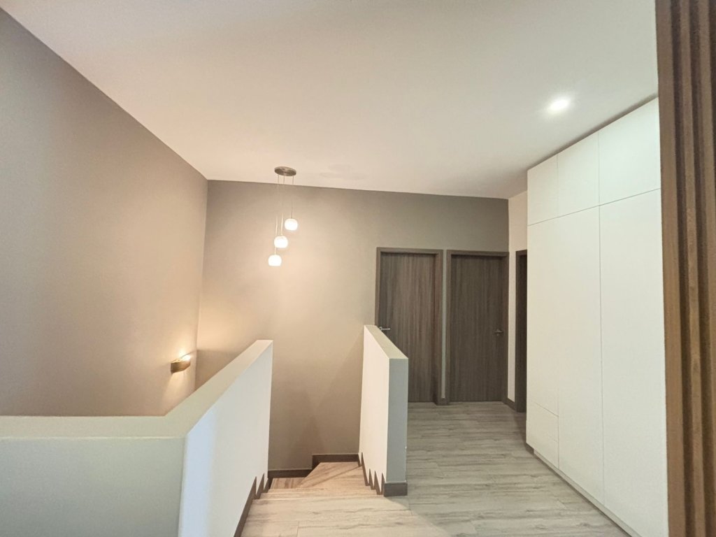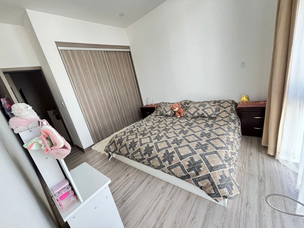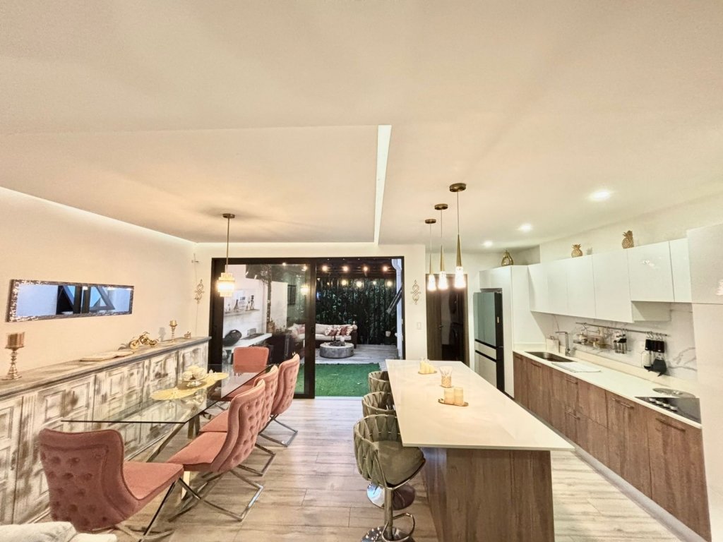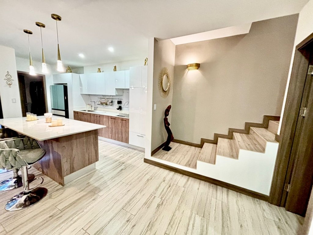 Al ingresar, el ambiente principal integra sala, comedor y cocina en un solo espacio abierto que resalta por su equilibrio visual. Las paredes blancas, la iluminación led y las cornizas decorativas en el cielo raso llaman mucho la atención, mientras que el piso de porcelanato tipo madera añade calidez. La cocina, es moderna y funcional, cuenta con una isla central que puede usarse como desayunador. En esta planta también se ubica un medio baño para visitas, discreto y de buen gusto.