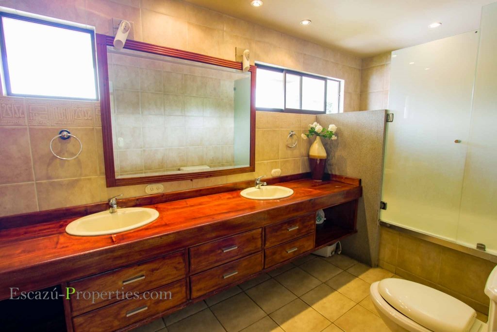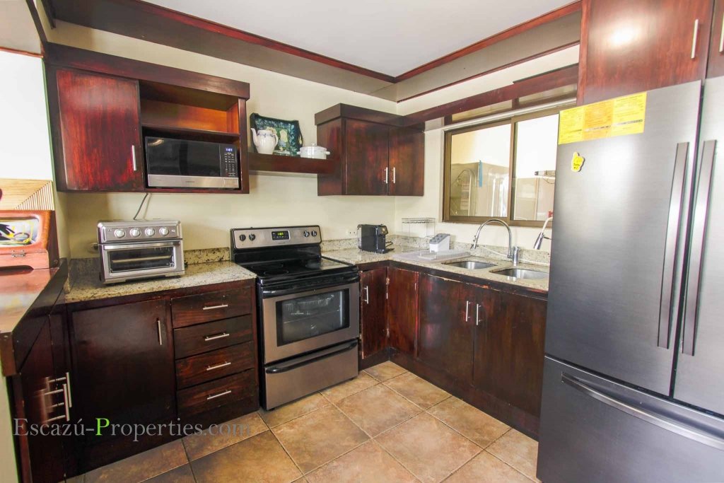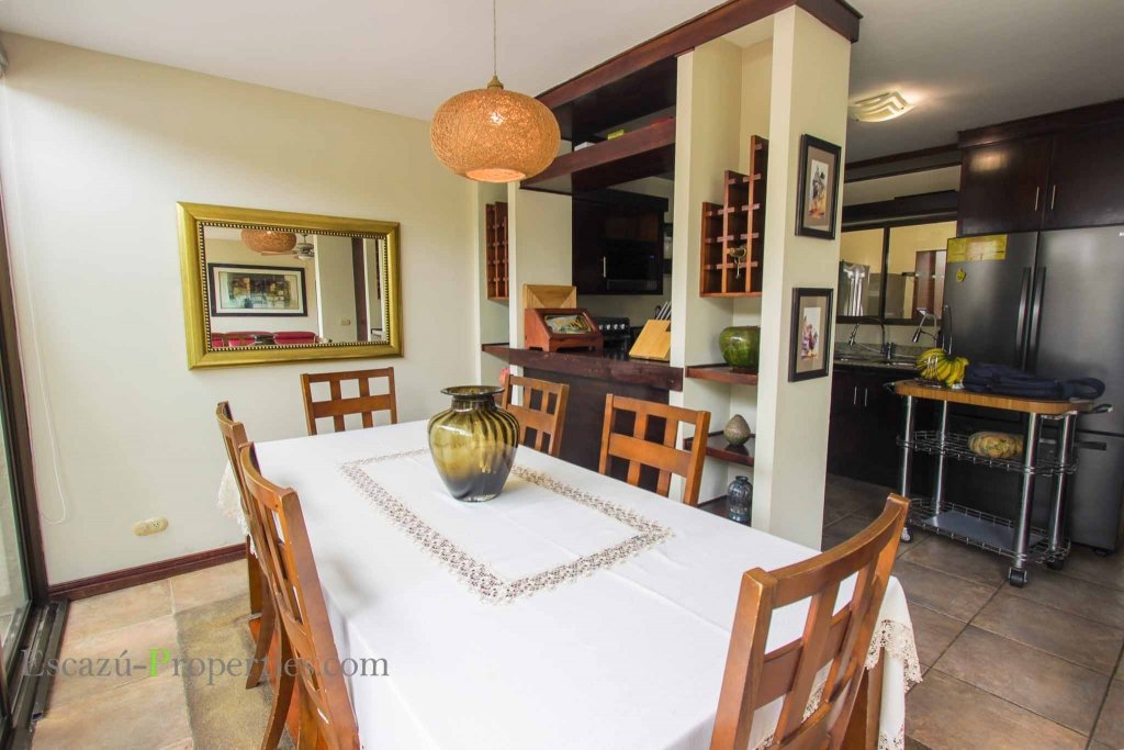La cocina es muy amplia con muebles en madera cubiertos con sobres de granito, mismos que se extienden hasta una barra desayunador que además sirve de división con el comedor.