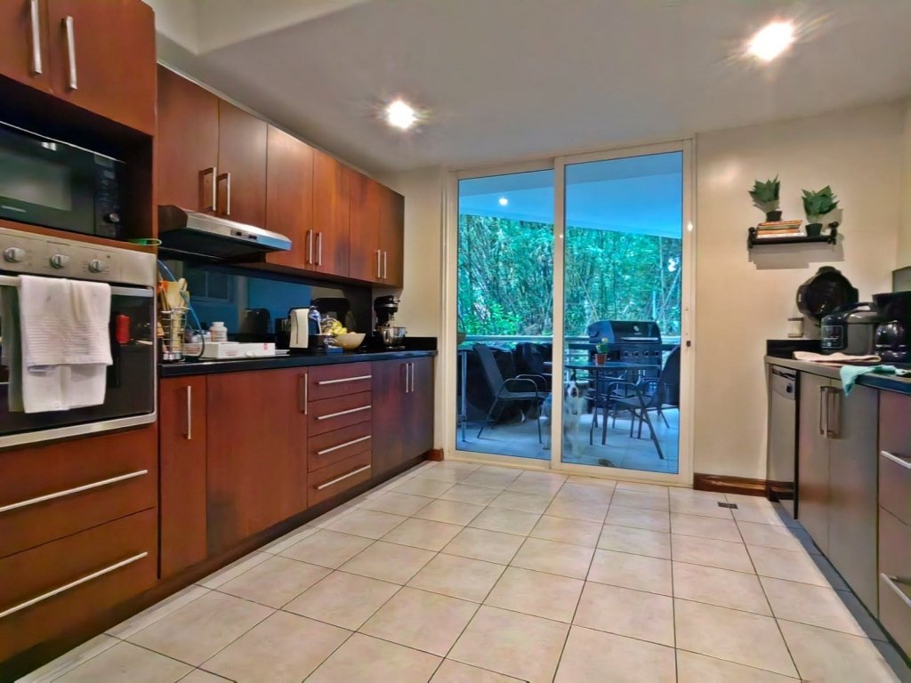 La cocina, ubicada estratégicamente a pocos pasos, es un modelo de funcionalidad y diseño muy atractivo con muebles de madera para almacenamiento y superficies de cuarzo de alta calidad.