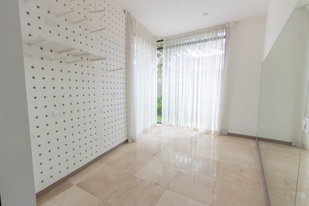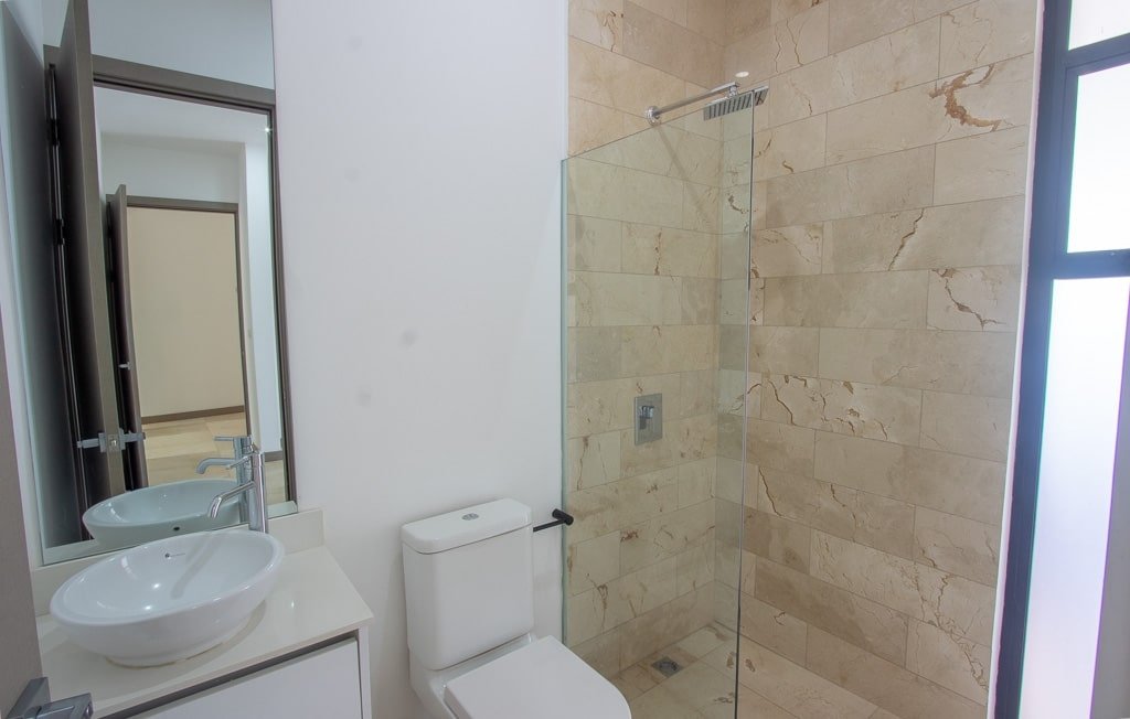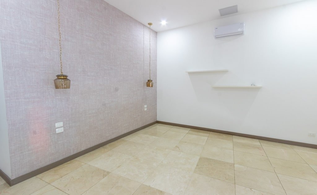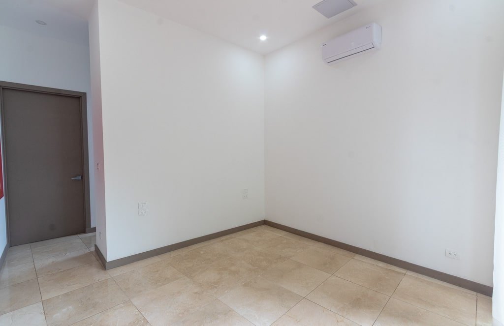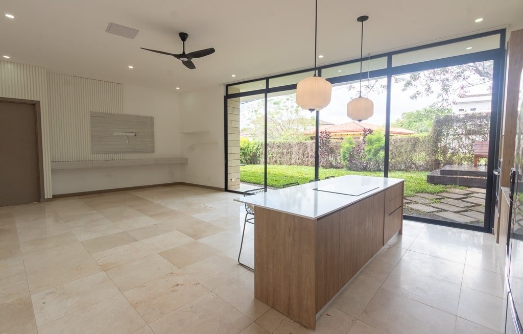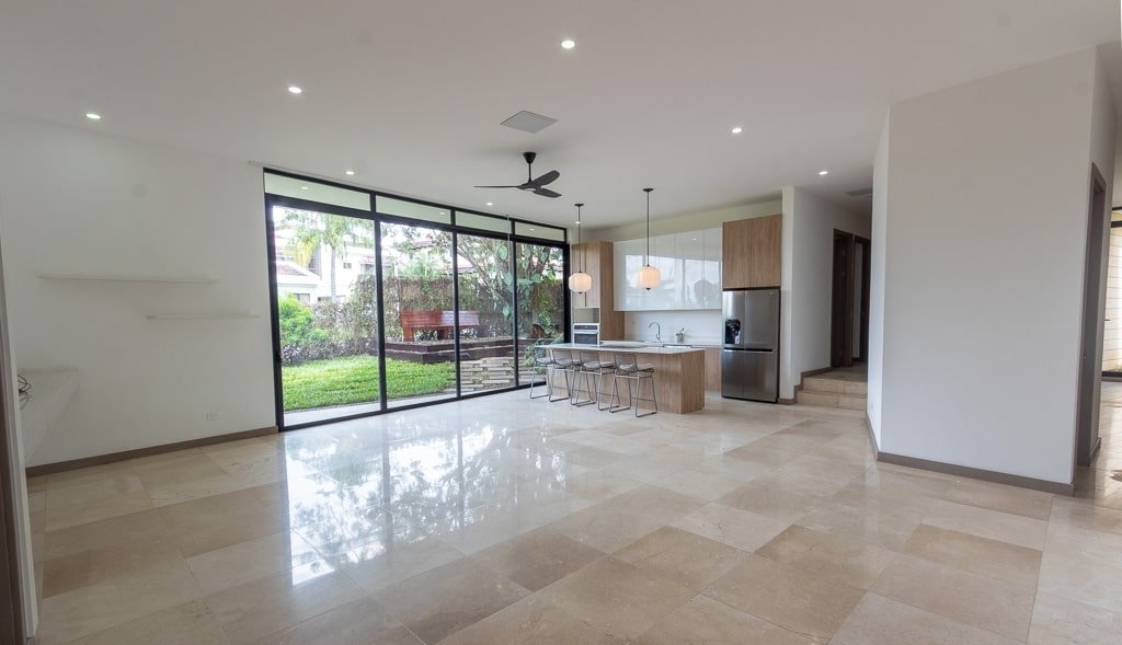 Posee sala, comedor y cocina integrados, un moderno concepto que facilita la movilidad y comunicación entre los espacios. Las paredes blancas, junto con el elegante rodapié de madera, y el piso de porcelanato crean una atmosfera elegante y muy acogedora, el marco perfecto para cualquier tipo de decoración. Moderna en Valle del Sol Santa Ana.