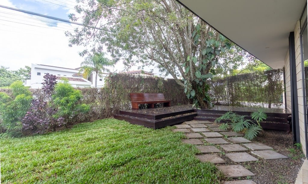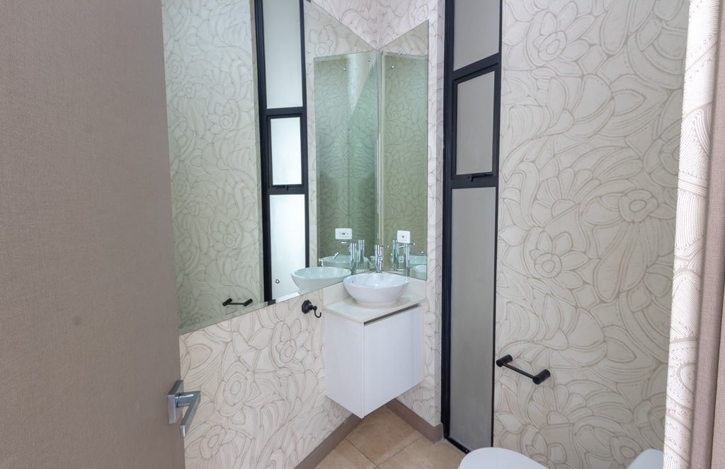 En el salón principal, también encontramos medio baño, ideal para atender a sus visitas de manera cómoda. Por otra parte, los ventanales corredizos dan paso al jardín trasero, por lo que el contacto con la naturaleza es prácticamente inmediato. Allí, algunos arbustos y un frondoso árbol acompañan un deck de madera ideal para colocar algunos muebles de exterior, tomar el sol y leer un buen libro.