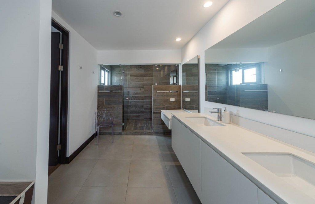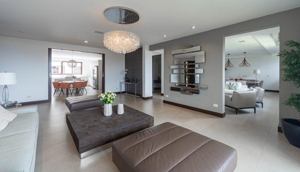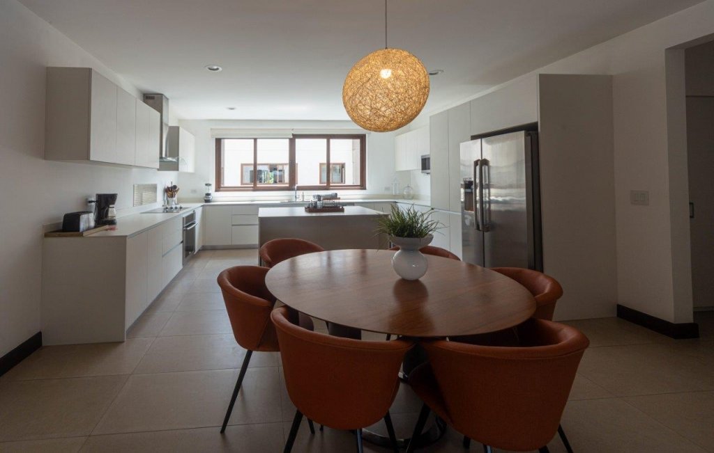 La propiedad en sí es un ejemplo de diseño contemporáneo, moderno, luminoso y altamente funcional. En el primer nivel, un amplio espacio principal se organiza de manera sutil para integrar sala de recibimiento, sala de estar, comedor y cocina, logrando una conexión fluida entre los ambientes. La cocina dispone de muebles de melamina blanca con gran capacidad de almacenamiento, entre gavetas, alacenas y estantes, y una isla central con sobre de cuarzo, material duradero, elegante y de fácil mantenimiento. Penthouse Escazu
