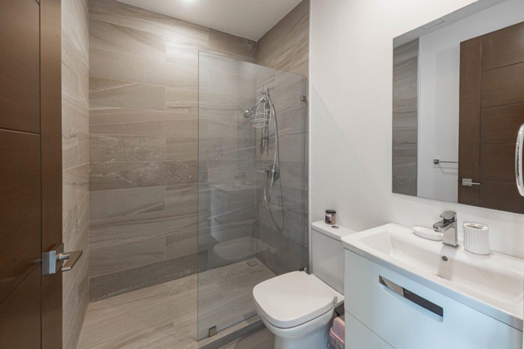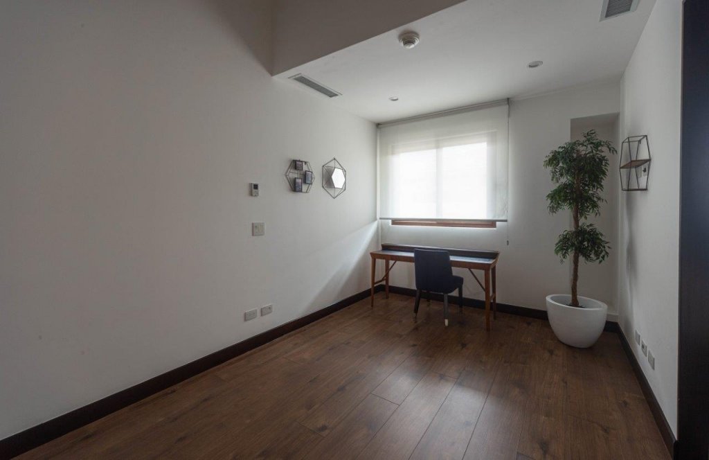 La propiedad dispone de dos espacios de parqueo y presenta una cuidada selección de materiales paredes blancas con detalles en gris, rodapiés de madera oscura, pisos de porcelanato mate en áreas sociales y de imitación madera en dormitorios, cornizas decorativas en los cielos rasos, y amplios ventanales corredizos que favorecen la entrada de luz natural y la circulación de aire fresco. Los baños, con sobres de cuarzo, grifería contemporánea y mamparas de vidrio, completan la armonía estética del diseño.