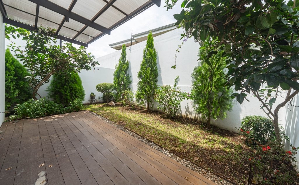 A tan sólo pasos, se ubica la terraza bajo techo que se conecta directamente con el jardín trasero, un espacio exterior privado, decorado con arbustos, flores y piedra decorativa, ideal para instalar muebles de descanso, parrilla o simplemente disfrutar la brisa al caer la tarde.