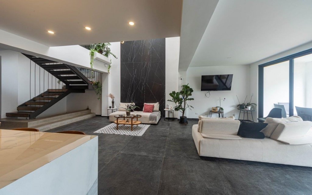 Al ingresar, nos recibe el salón principal de doble altura, un espacio amplio que integra la sala, el comedor y la cocina en un solo ambiente. Los grandes ventanales permiten que entre abundante luz natural y conectan directamente con la terraza y el jardín. El piso de porcelanato negro mate da un toque de elegancia y modernidad que resalta de inmediato.