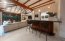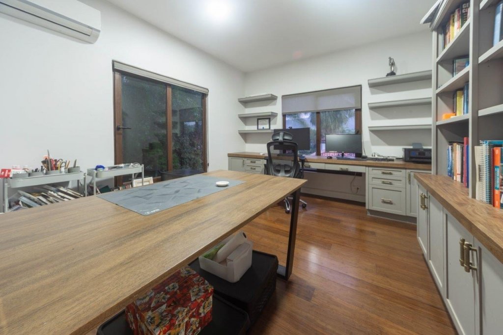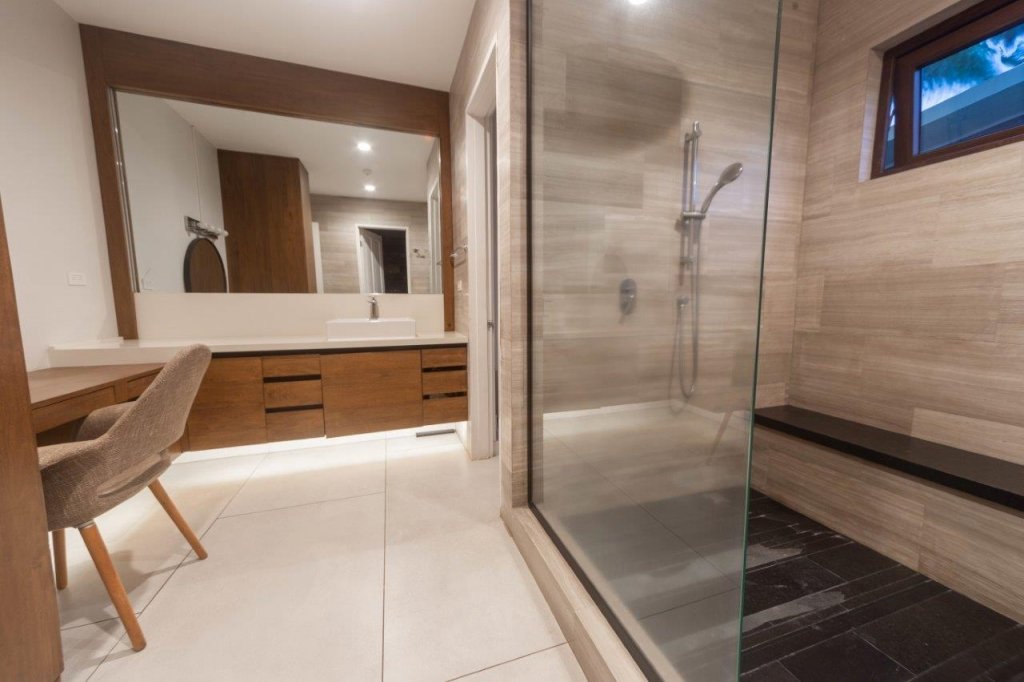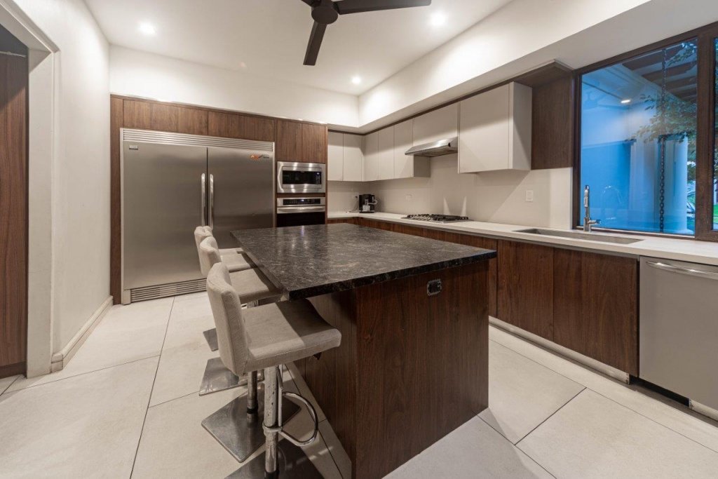 La cocina está a solo unos pasos del salón, y ha sido diseñada con mucho cuidado, los muebles de apoyo son de melamina con un diseño sofisticado, mientras que las encimeras son de cuarzo. Una isla central funciona como desayunador, también hay un gran lavatorio, espacios empotrados para electrodomésticos y un ventanal corredizo que se abre al jardín, permitiendo que la brisa y la luz natural inunden el interior.