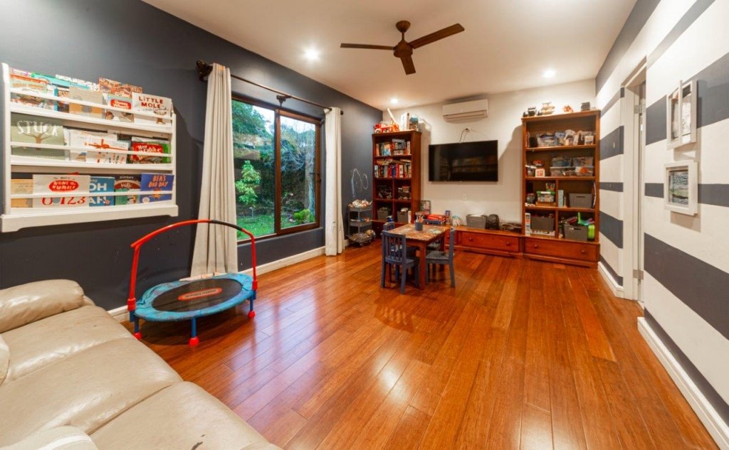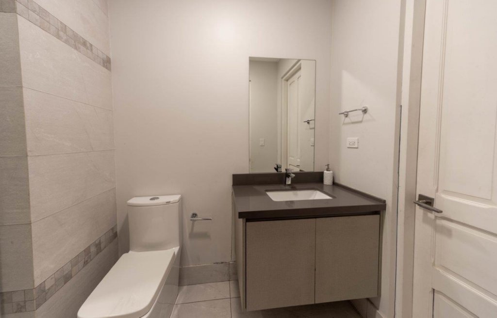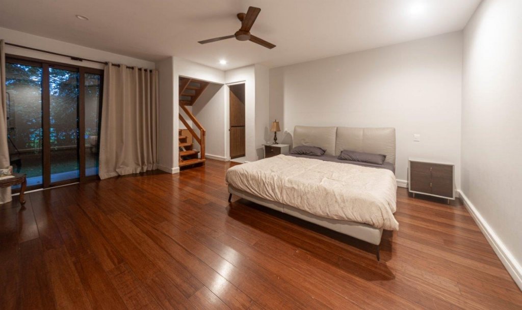 En cuanto a habitaciones, la casa cuenta con tres dormitorios muy amplios. Cada uno tiene suficiente espacio para colocar dos camas si se deseara, y todos conectan directamente al jardín, lo que facilita el disfrute del exterior. Los pisos son de laminado con apariencia de madera, aportando calidez y elegancia. La habitación principal es tipo suite y ofrece un baño privado con un tocador refinado, además de un ático multiuso.