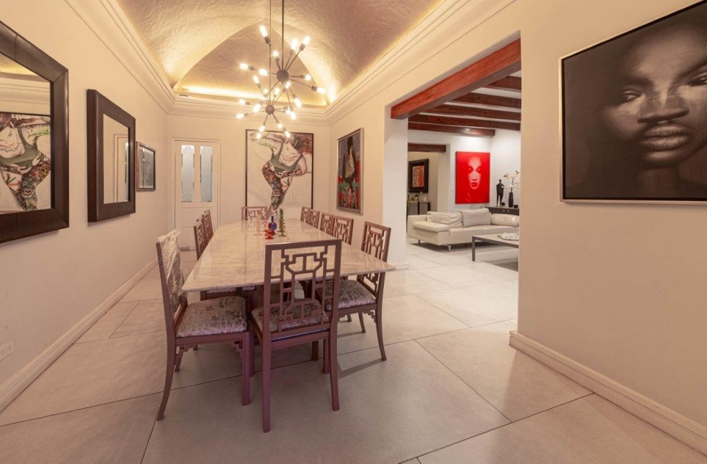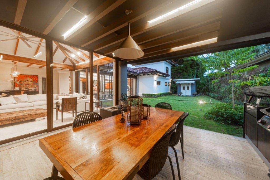 Al ingresar al salón principal, encontramos la sala de recibimiento, la sala de televisión, el bar y el comedor que están integrados. Este gran salón se distingue por su elegante piso de porcelanato mate, sus paredes blancas impecables, una iluminación LED cálida y vigas de madera visibles en el cielo raso, que dan una sensación de solidez y calidez al mismo tiempo. Una Planta en Bosques de Lindora