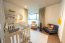 El salón principal combina sala, comedor y cocina en un concepto abierto, con elegantes gabinetes en melamina, sobres de granito y un refinado piso de porcelanato imitación madera que armoniza con paredes blancas y detalles de concreto expuesto.