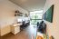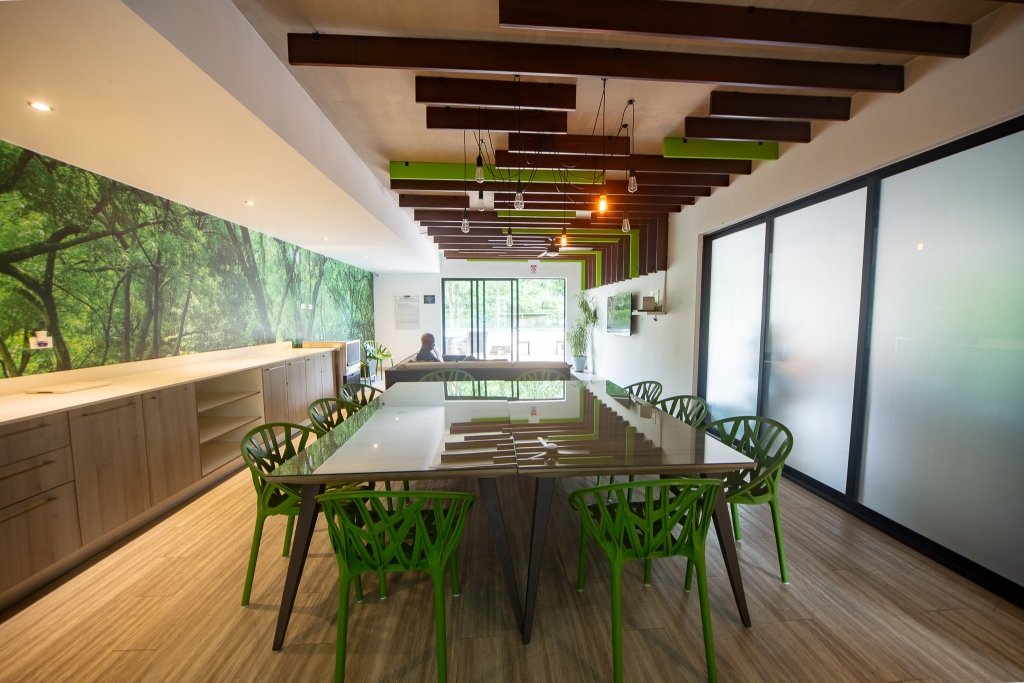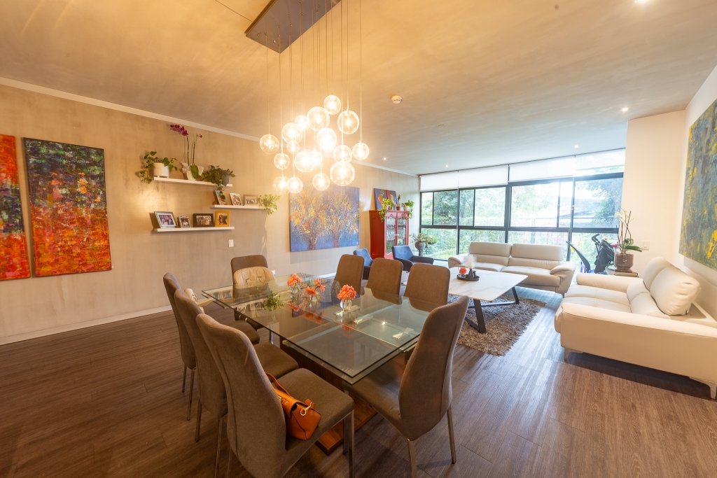 Con 174 m² habitables, este apartamento se distingue por sus espacios generosos, llenos de luz natural. Sus amplios ventanales corredizos, enmarcados en aluminio oscuro, permiten disfrutar de una iluminación inigualable y una ventilación natural constante, además de conectar visualmente el interior con el exuberante entorno verde que rodea el condominio.