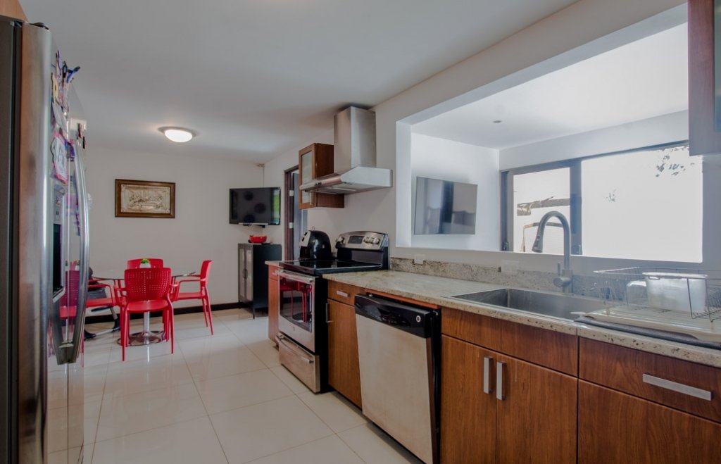 La cocina ha sido diseñada con un enfoque práctico y estético, cuenta con múltiples gabinetes de madera, amplias superficies de trabajo en granito y una distribución funcional que favorece el orden y la comodidad al cocinar o recibir invitados. En un espacio cerrado que permite un comedor auxiliar. Además, cuenta con una ventana amplia dando abundante luz natural, que comunica con un área multiuso que permite acceso hacia un encantador jardín con grama sintética y una acogedora terraza techada, perfecta para compartir reuniones familiares, celebraciones o simplemente disfrutar de un momento al aire libre con total privacidad.
