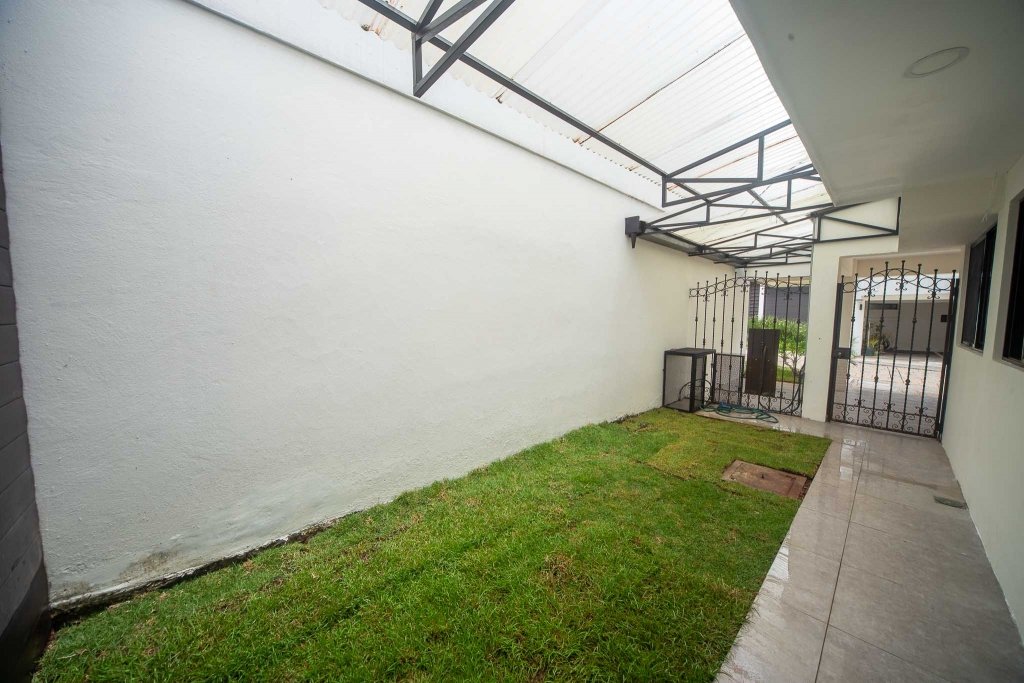 En la fachada frontal encontramos espacio de parqueo para dos vehículos, y a un lateral posee un pequeño jardín techado con zacate natural, ideal para disfrutar del aire fresco sin