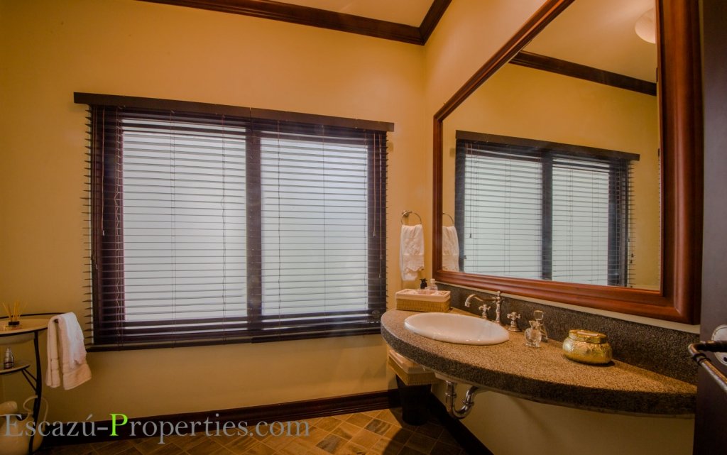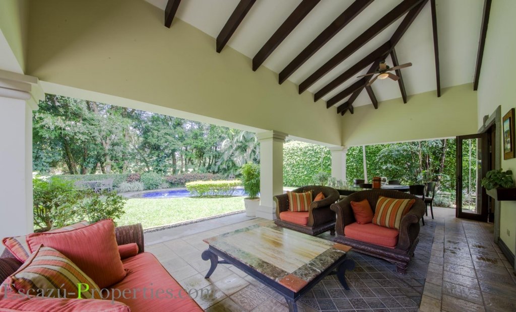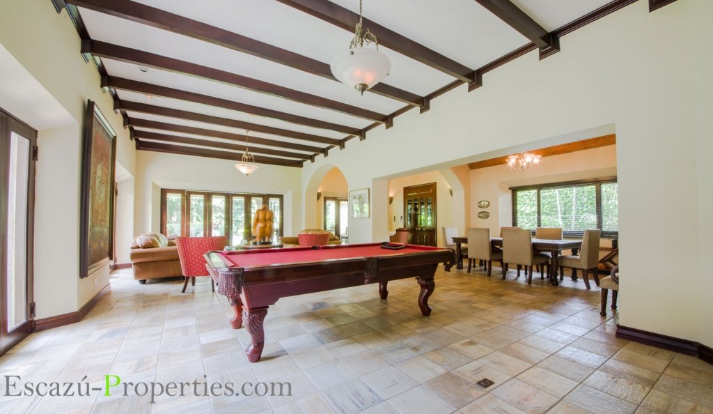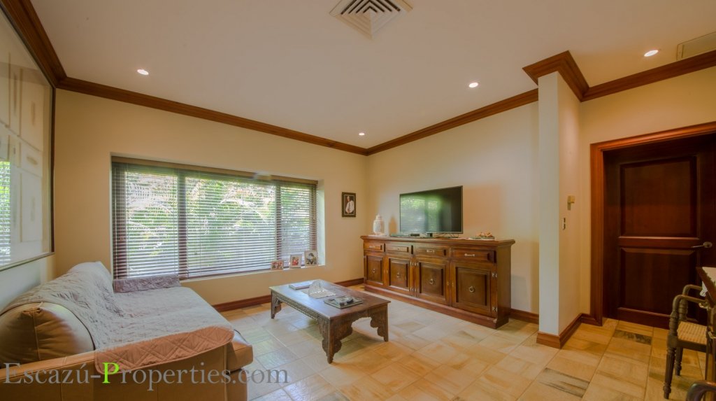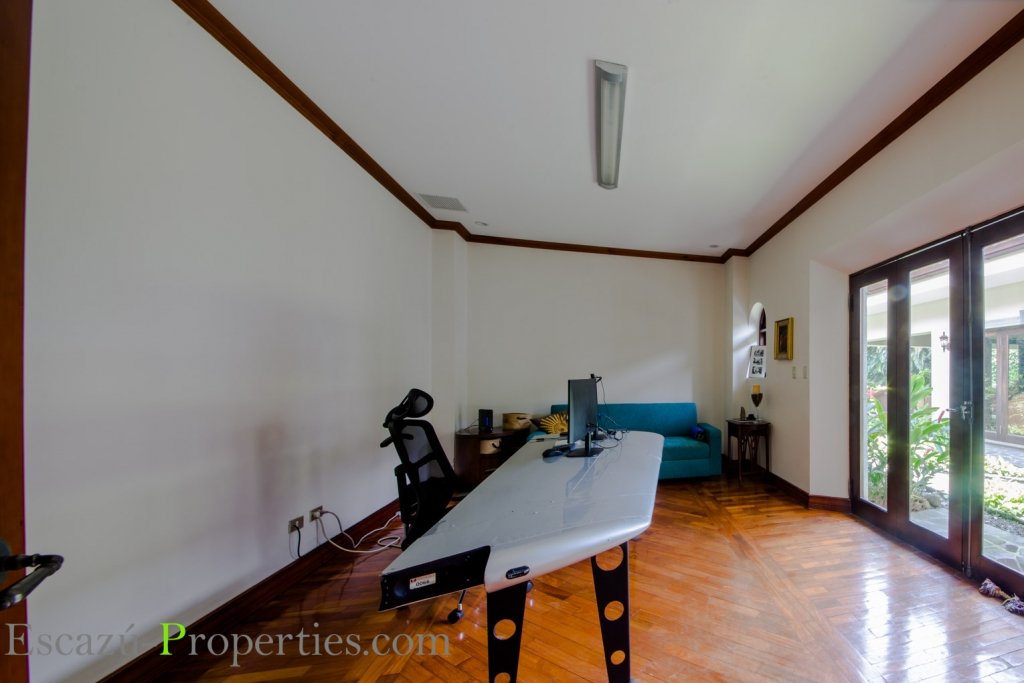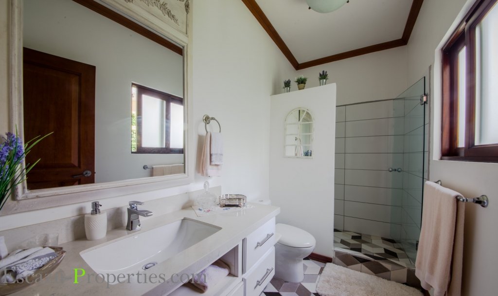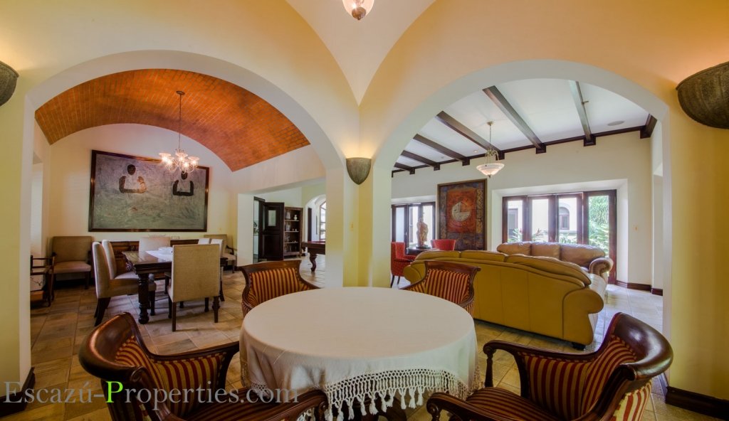 Además esta casa en Valle del Sol, Lindora, ofrece Sala y comedor en un salón enorme, con mucha luminosidad natural, bajo espectaculares cielos tipo catedral, incluso algunos con ladrillo de demolición y otros con lindas vigas expuestas decorativas en madera sólida. Hay sala para TV y medio baño para visitas.